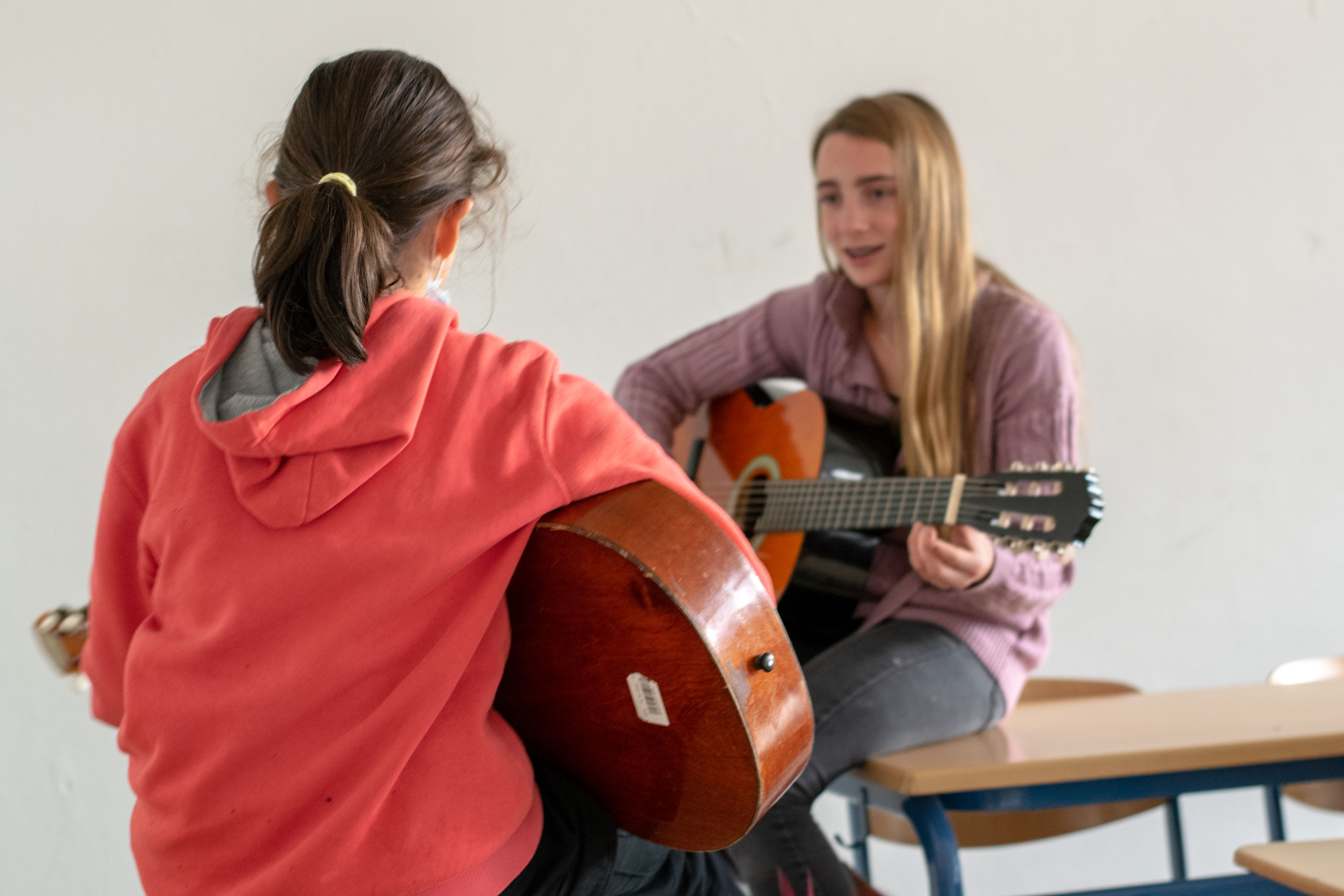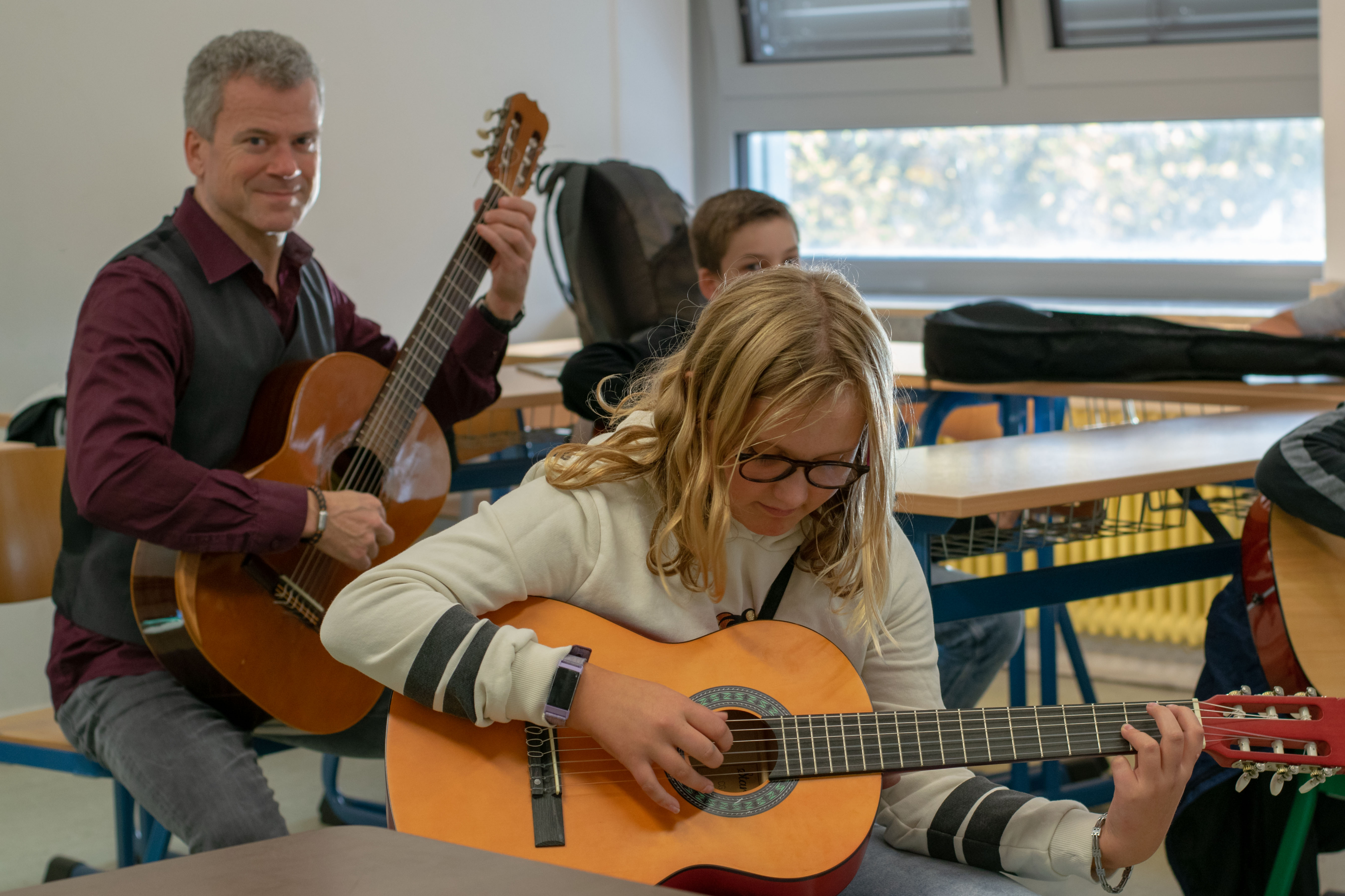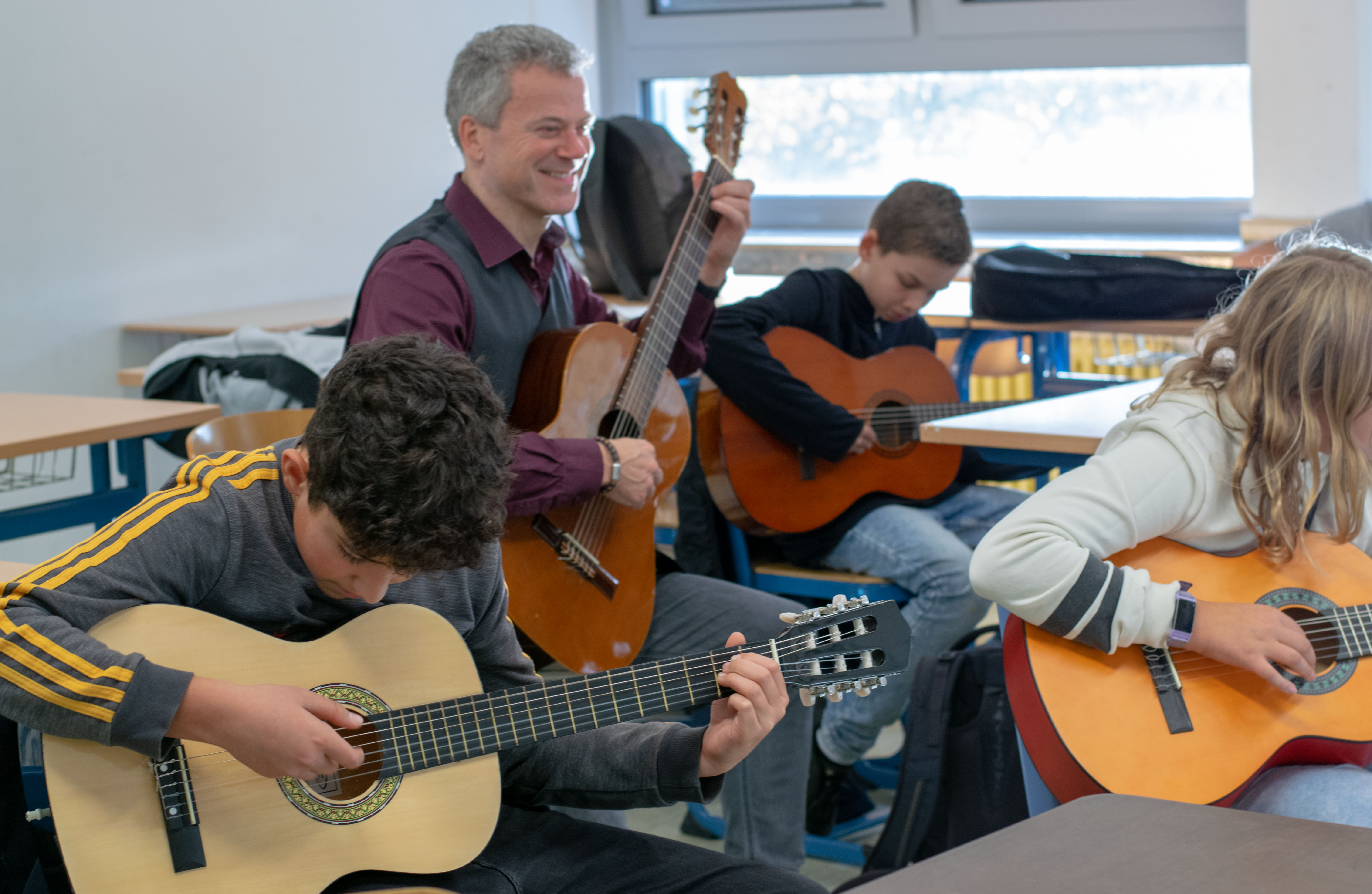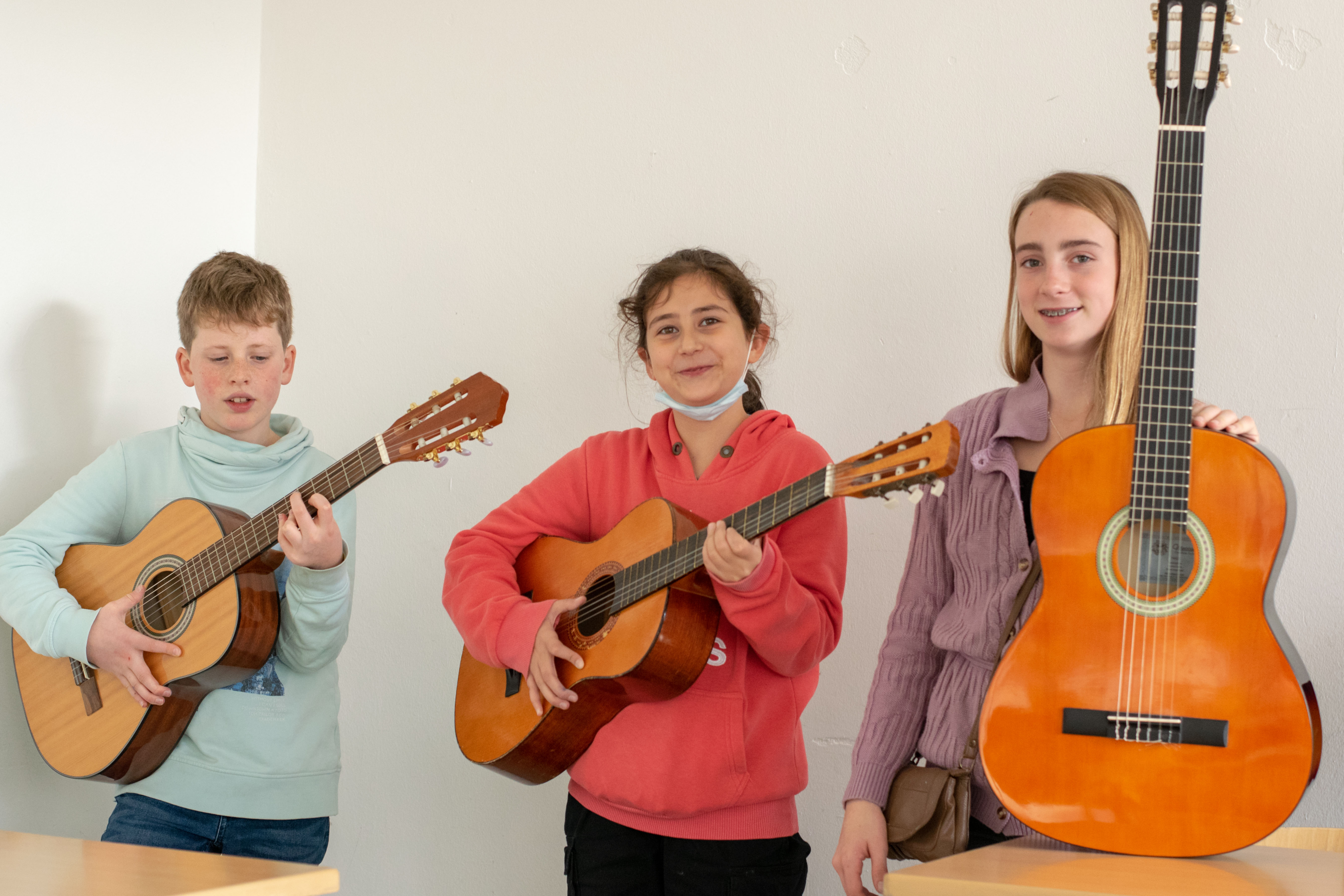 Die AG Gitarre für Anfänger richtet sich an die SchülerInnen, die schon immer einmal Lust hatten, das Instrument Gitarre kennen und spielen zu lernen. Grundkenntnisse sind erstmal nicht erforderlich, aber die SchülerInnen sollten schon ein grundsätzliches Interesse an Musik haben. Dann kann es losgehen... Der Unterricht findet in der Gruppe statt, viele Übungen werden gemeinsam eingeübt und können dann mit einem – hoffentlich eigenen – Instrument zu Hause weiter geübt werden. Und dann? Dann kommt der nächste Meistergitarrist unserer Schulband hoffentlich aus den Reihen der Gitarren-AG für Anfänger…!