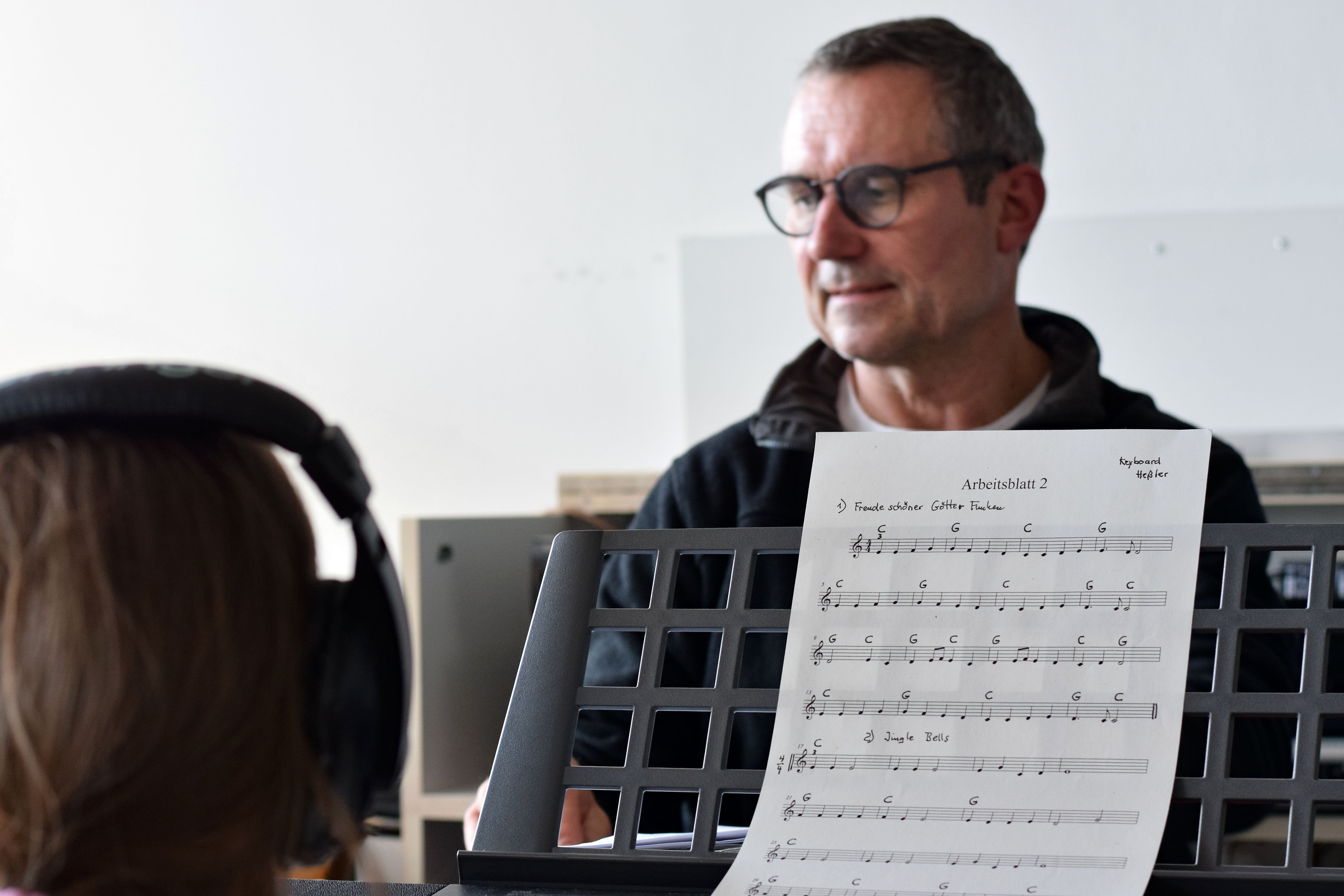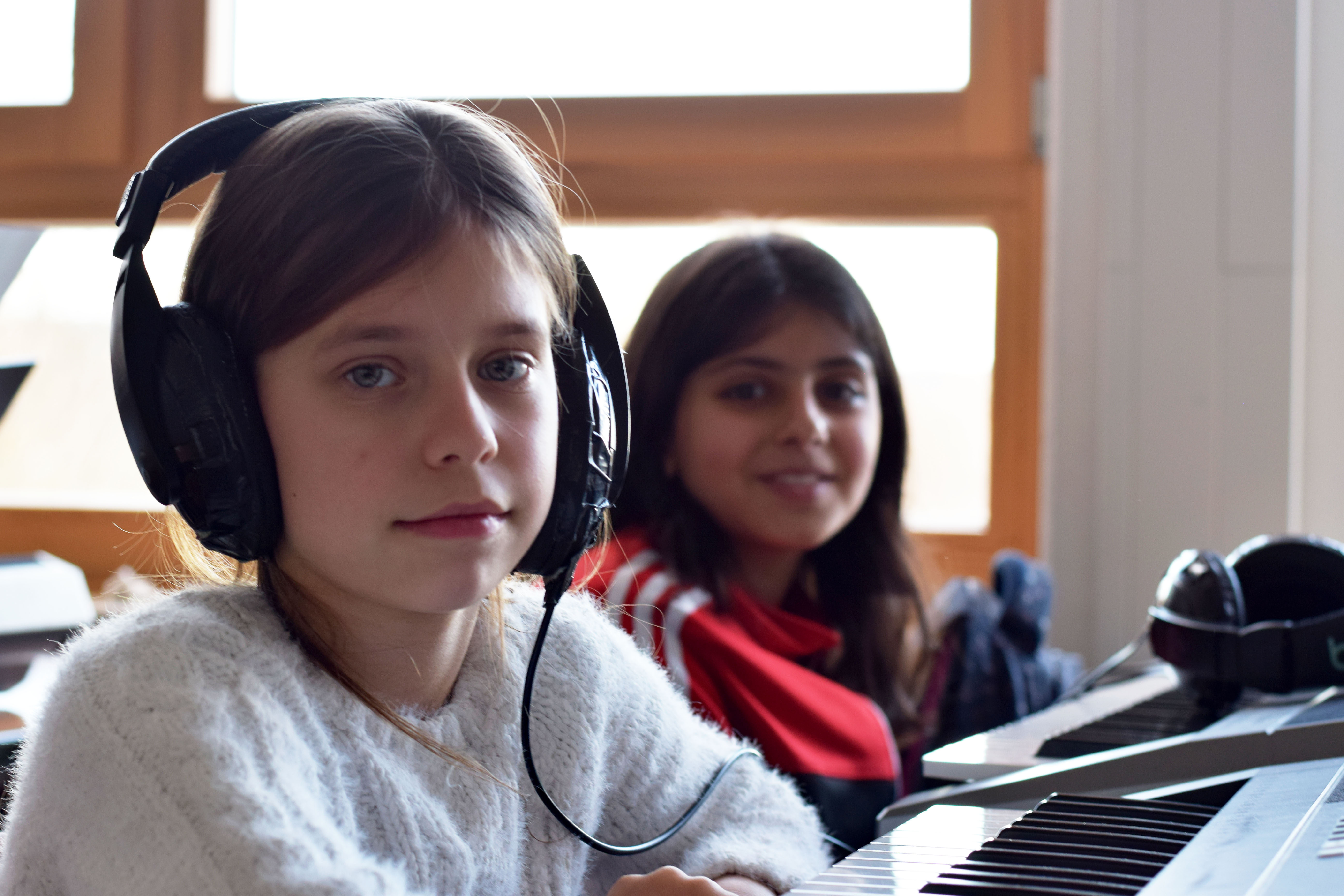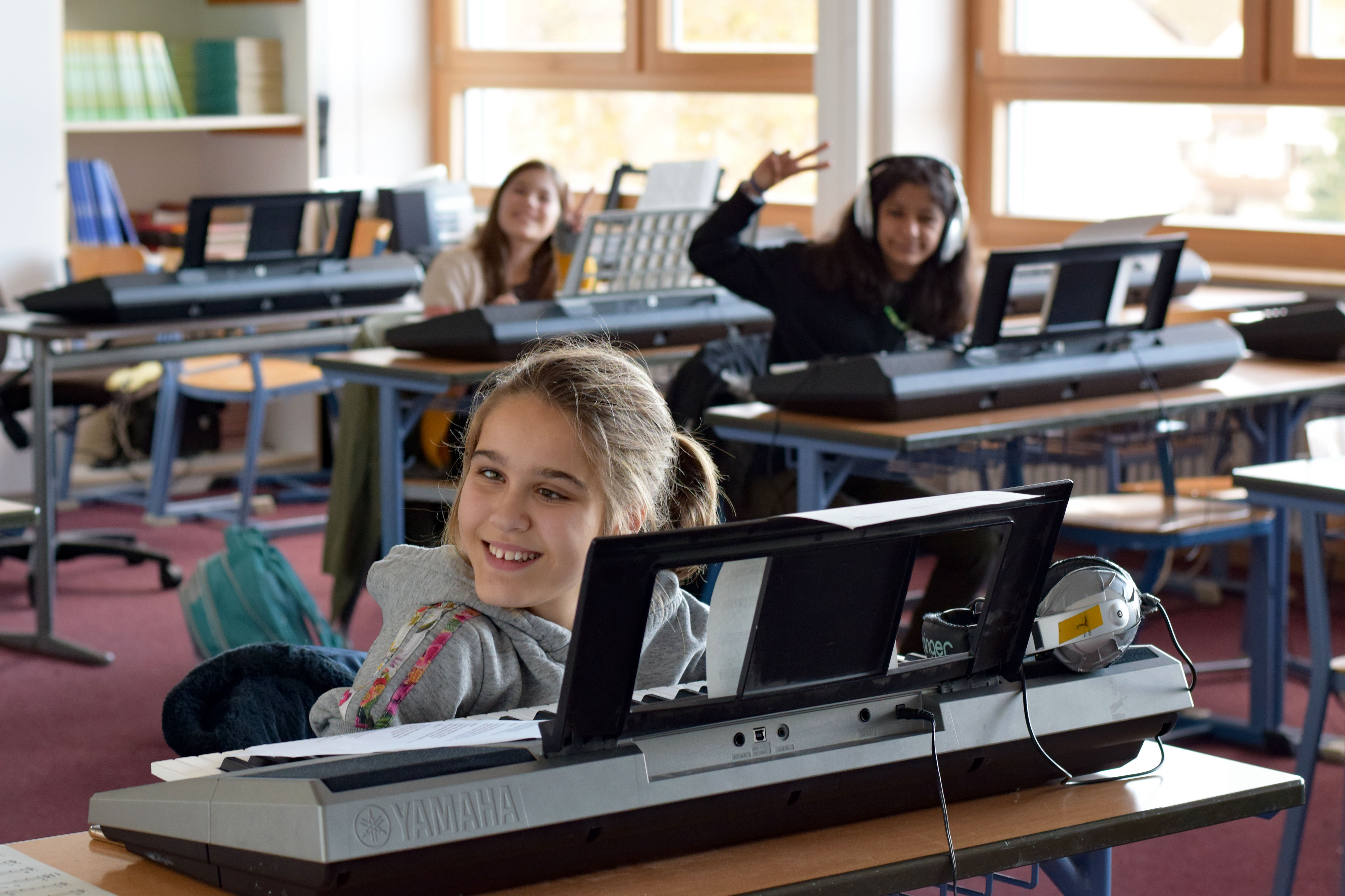 Jede(r) von euch hat Lieblingslieder, die er/sie hört und gerne singen und spielen würde. Herr Heßler versetzt euch in die Lage, in einer Gruppe zusammen zu musizieren und Musikstücke - wenn möglich auch Lieblingsstücke - gemeinsam zu erarbeiten. Dafür lernt ihr im Keyboardraum auf den Keyboards zu spielen und gemeinsam zu singen. Auch andere Instrumente (Trommeln und Perkussion) sollen eingebaut werden.