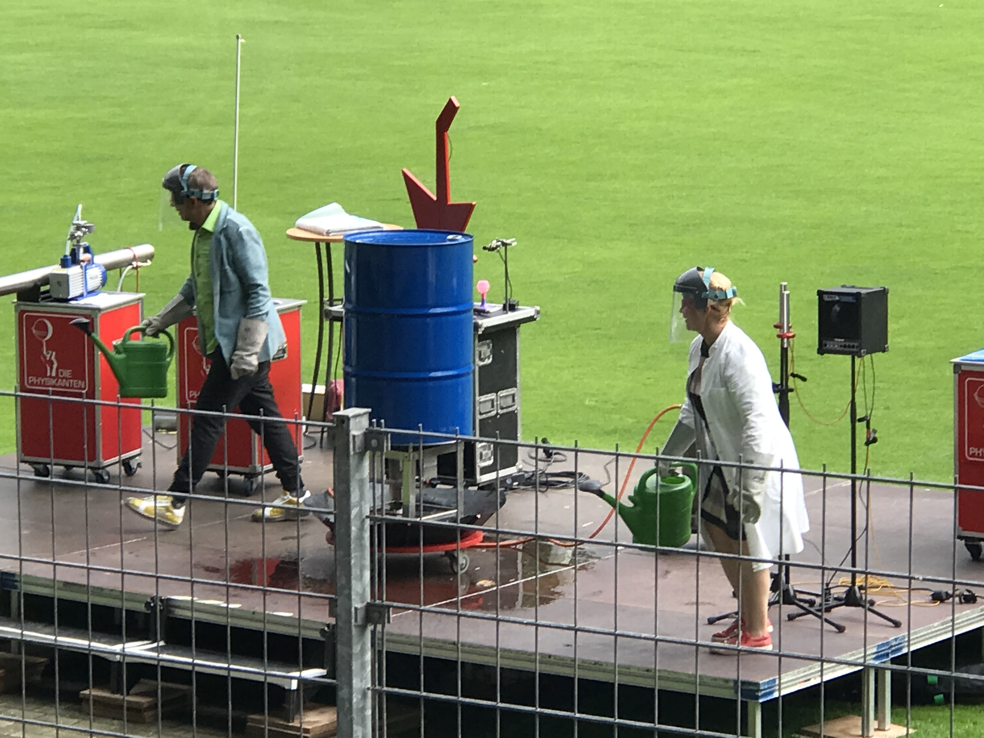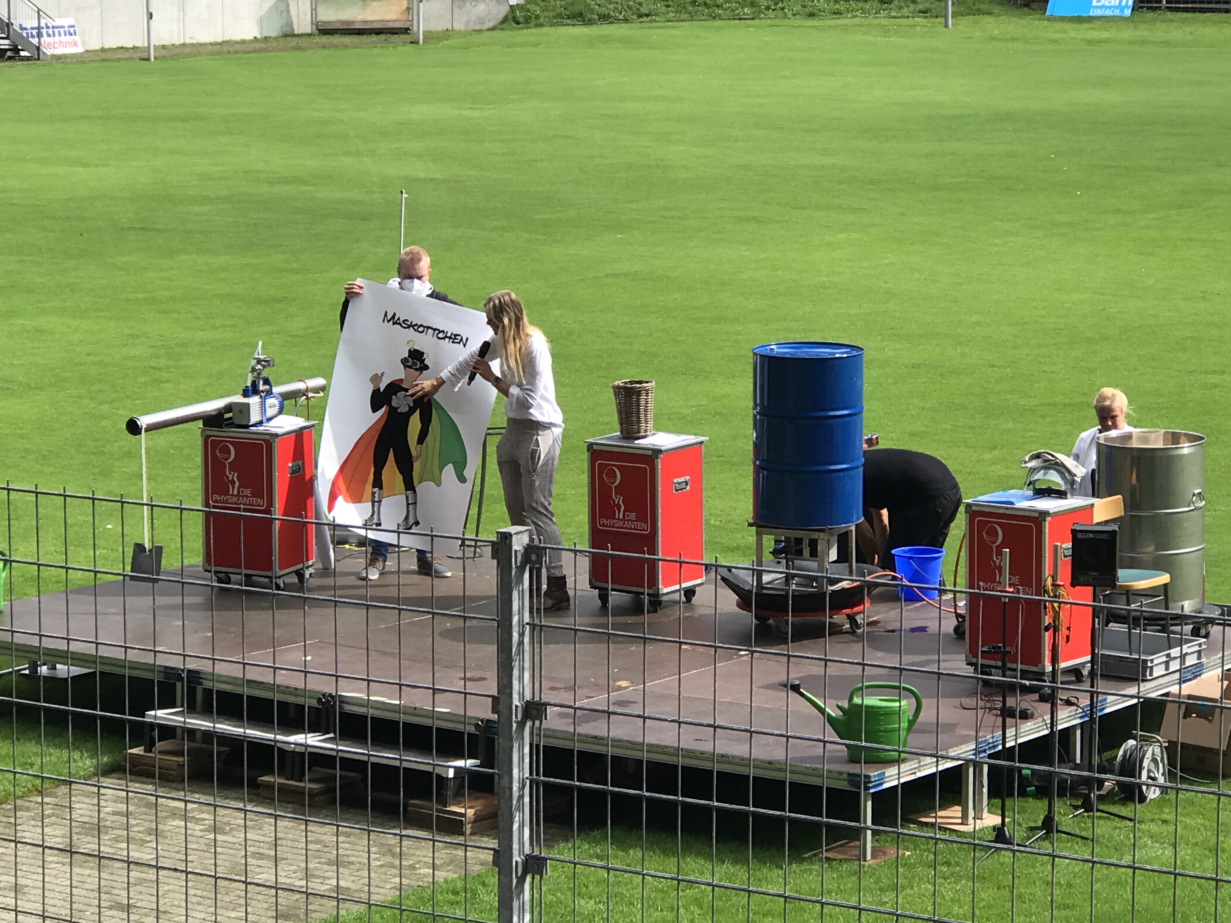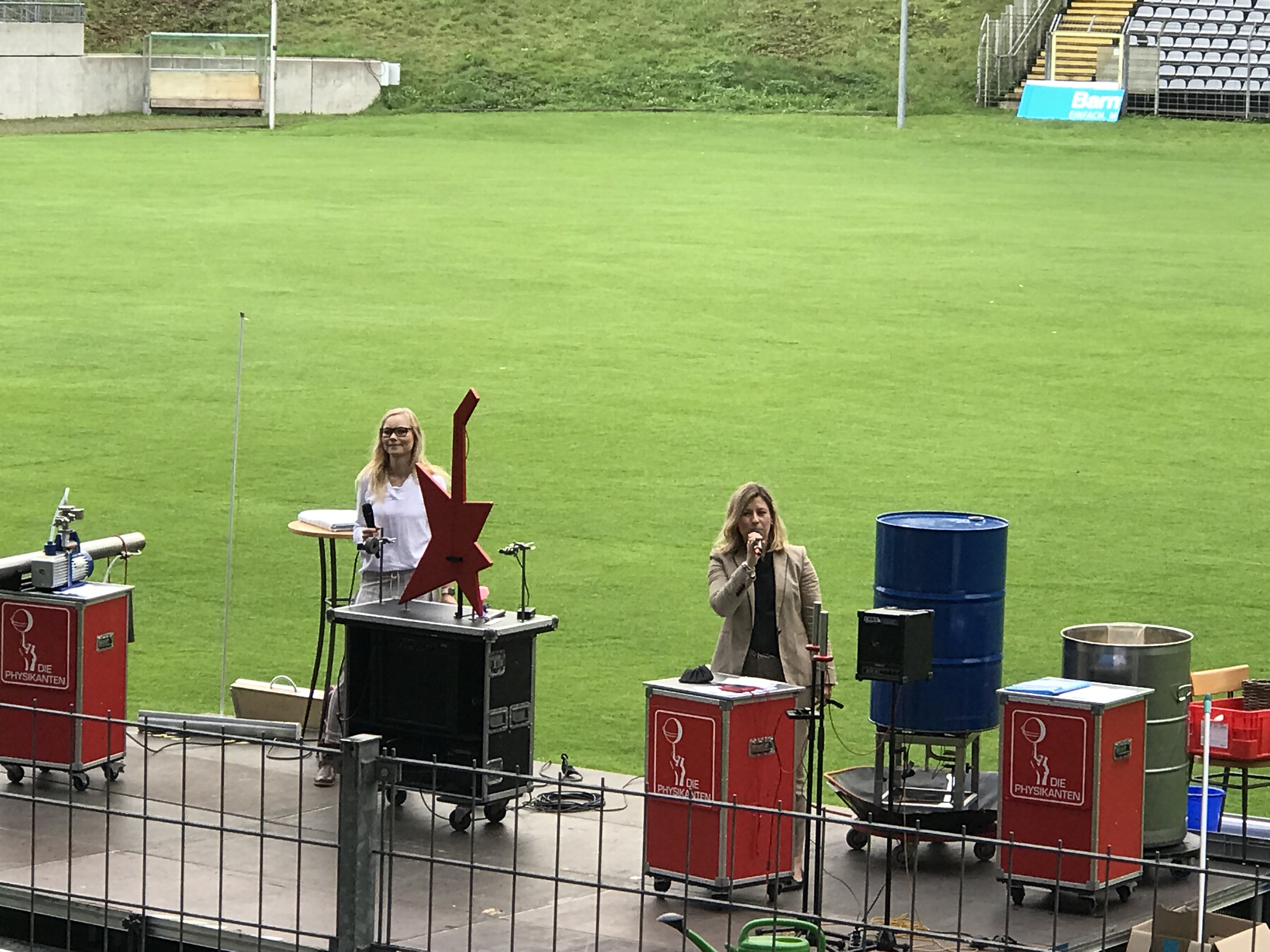 Corona Vogtländer führte durchs Programm und die Klassen 7E und 7F sowie Schüler*innen der Klasse 9F genossen das Programm. Die „Physikanten“ experimentierten und erklärten anschaulich, was man unter einem Vakuum versteht, wie Strom durch menschliche Körper fließt und ein Radio antreibt, wie Wasserstoff explosive Highlights liefert und vieles mehr, ein tolles Spektakel! Einige unserer Schüler*innen durften sogar Teil der Show auf der Bühne werden…