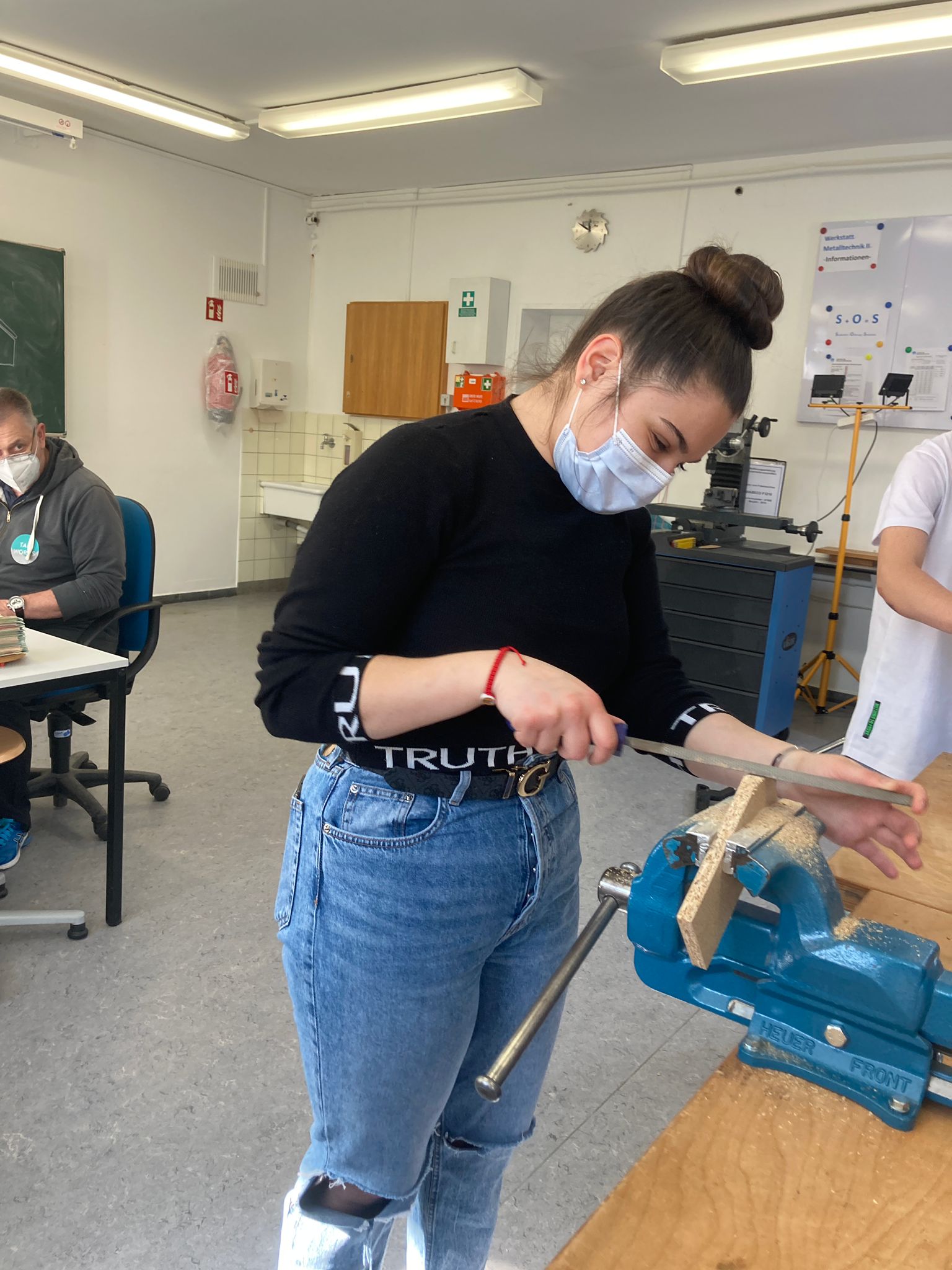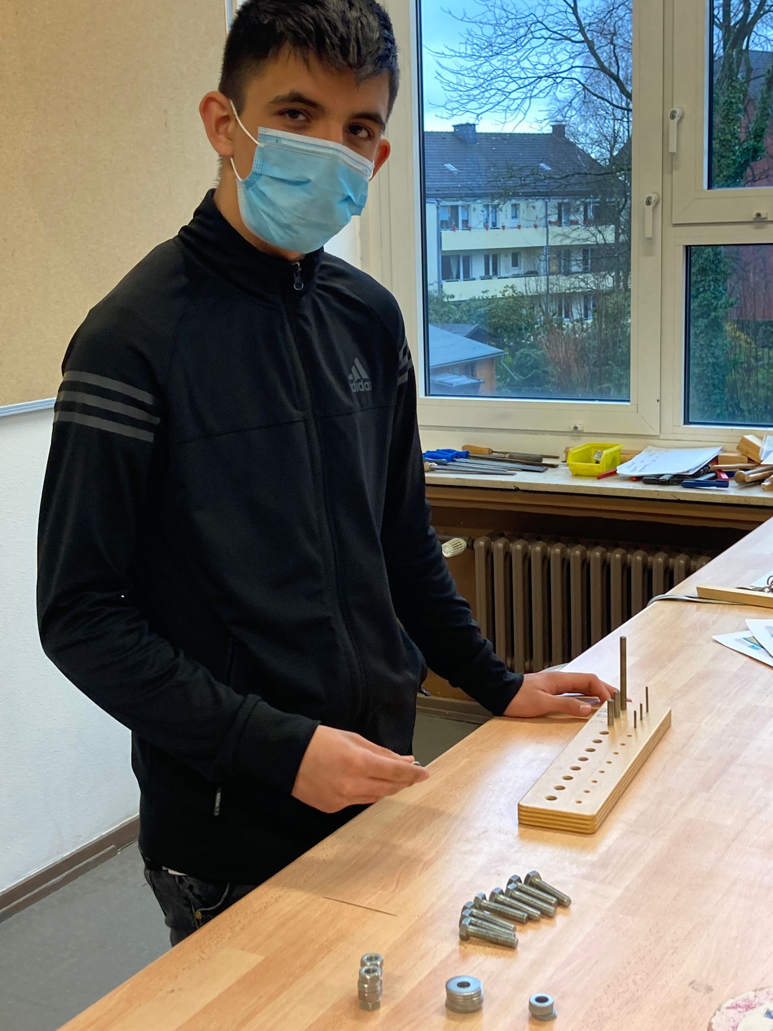Die Förderschüler:innen der Klassen 7E und 7F nehmen momentan an der Diagnostik teil und durchlaufen die Teststationen, an denen auf verschiedenen Niveaustufen unterschiedliche Fähigkeiten überprüft werden. Hier wird genäht, gehämmert, gezeichnet und geschliffen und mancher entdeckt ungeahnte Fähigkeiten. So wie Maurice aus der 7F, der besonders viel Freude am Schleifen und Sägen hat. Sein Klassenkamerad Oussama zieht ein noch viel positiveres Fazit: „Mir hat alles gut gefallen und ich konnte auch alles sehr gut.“ Und auch Bengisu aus der 7E hat viel Positives zu berichten: „Ich hatte viel Spaß am Koordinatensystem. Das Nähen konnte ich vorher nicht, dann habe ich das aber hinbekommen, obwohl es auch anstrengend war. Es war nicht so langweilig, wie es manchmal in der Schule ist und alle waren total nett.“