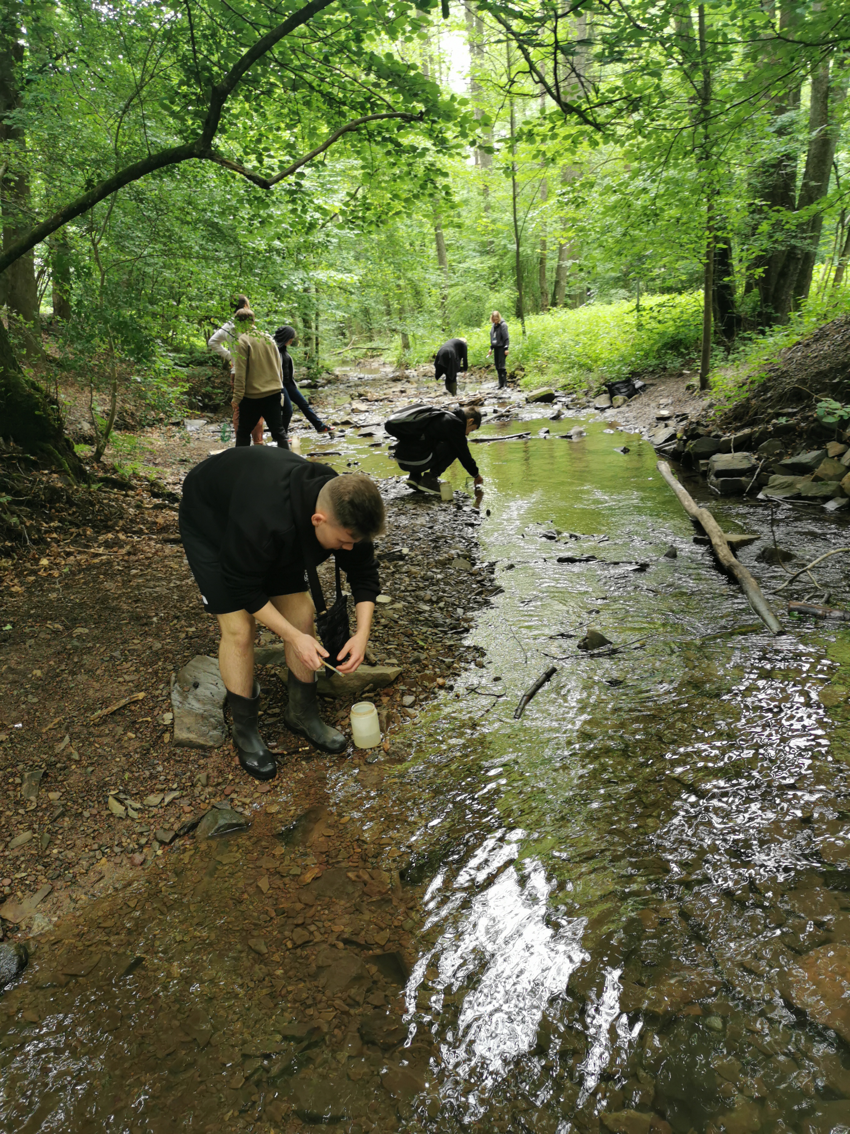 Am Freitag, den 10. Juni 2022, besuchte der Biologie-LK die Station Natur und Umwelt. Dort belegten die Schülerinnen und Schüler einen Kurs zum Ökosystem Bach, den Herr Ziegler begleitete. Nachdem sie sich den See in der Theorie erschlossen hatten, sollte nun die Praxis an einem fließenden Gewässer erfolgen. Also wanderte der Kurs von der Station durch den Wald immer weiter bergab bis zur tiefsten Stelle des Tals an die Gelpe. Dort angekommen, wurden einige Lebewesen des Baches behutsam gefangen, um sie später bestimmen und damit Rückschlüsse auf die Qualität des Gewässers ziehen zu können. Auch der Verlauf der Gelpe wurde untersucht. Mit den Tieren in den Behältern ging es anschließend zur Station zurück. Die dort bestimmten Wasserlebewesen ließen am Ende des Seminars den Schluss zu, dass die Gelpe ein Gewässer der Güteklasse I bis II ist – sich also in einem guten und naturnahen Zustand befindet. Nachdem die untersuchten Tiere an ihrer Entnahmestelle wieder freigelassen wurden, endete die Exkursion mit neuen Erkenntnissen über die Bedeutung gesunder Fließgewässer in Deutschland.