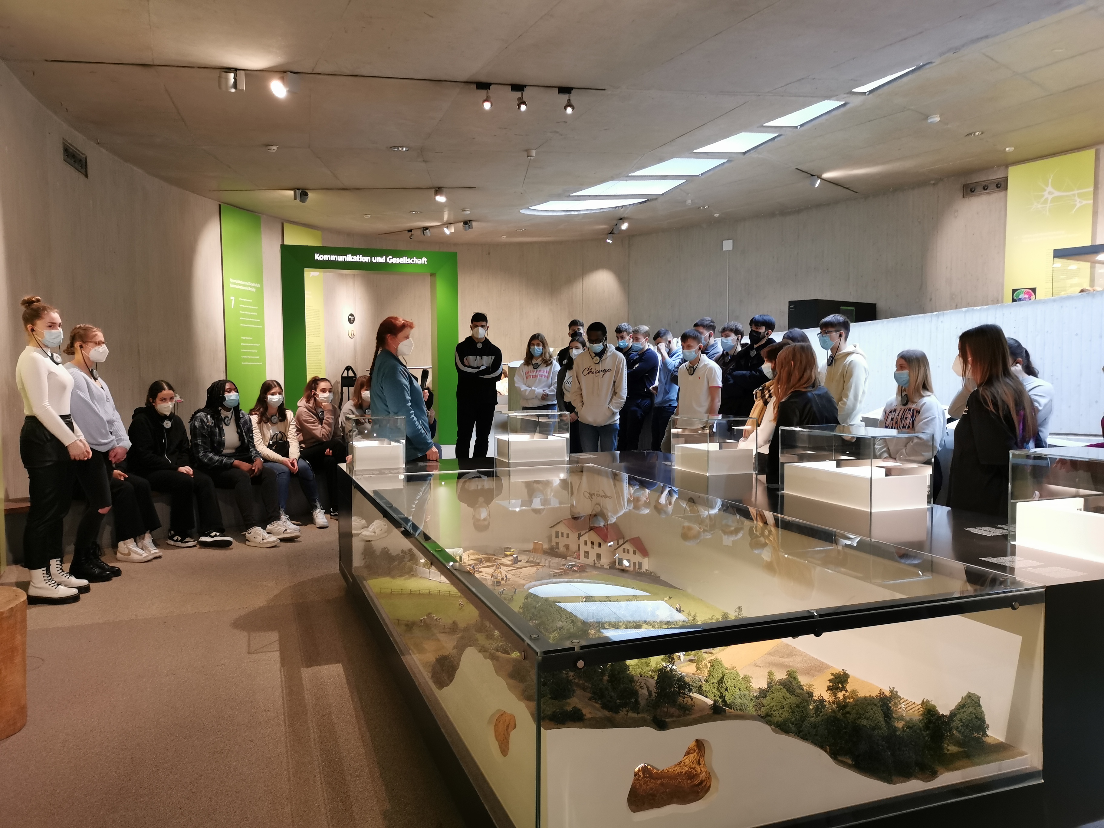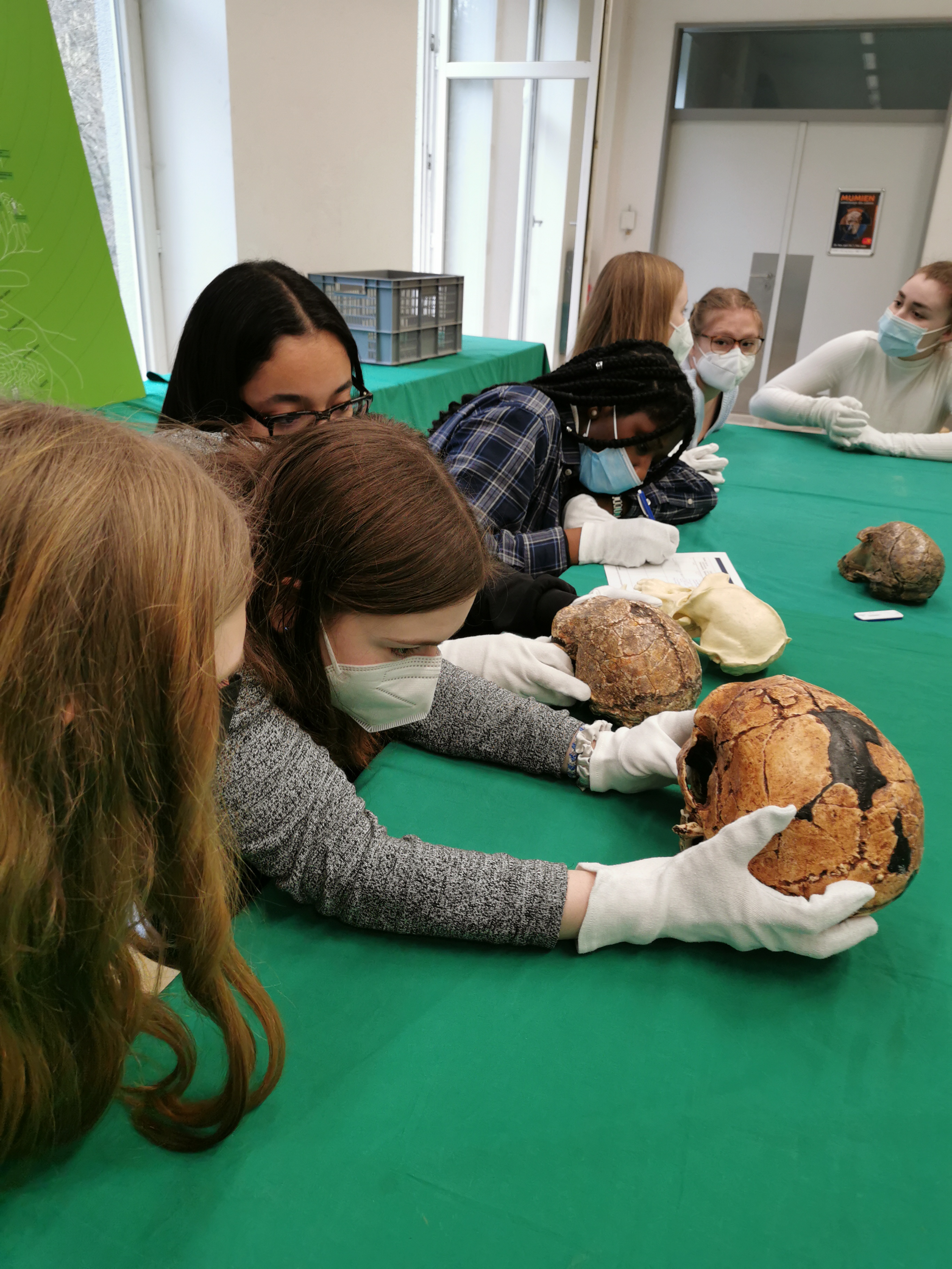 Nach dem Workshop wanderten die Kurse von der Werkstatt rüber zum Museum. Hier durchliefen sie die Humanevolution in 90 Minuten – angeleitet durch eine Mitarbeiterin, die sehr vernetzt die Inhalte präsentierte. Dabei ging es bei Weitem nicht nur um weit zurückliegende Ereignisse, sondern auch politisch aktuelle Themen: Die Evolution belegt nämlich, wie wichtig der kulturelle Austausch über Ländergrenzen hinweg ist und dass man Rassismus keinen Raum geben darf!