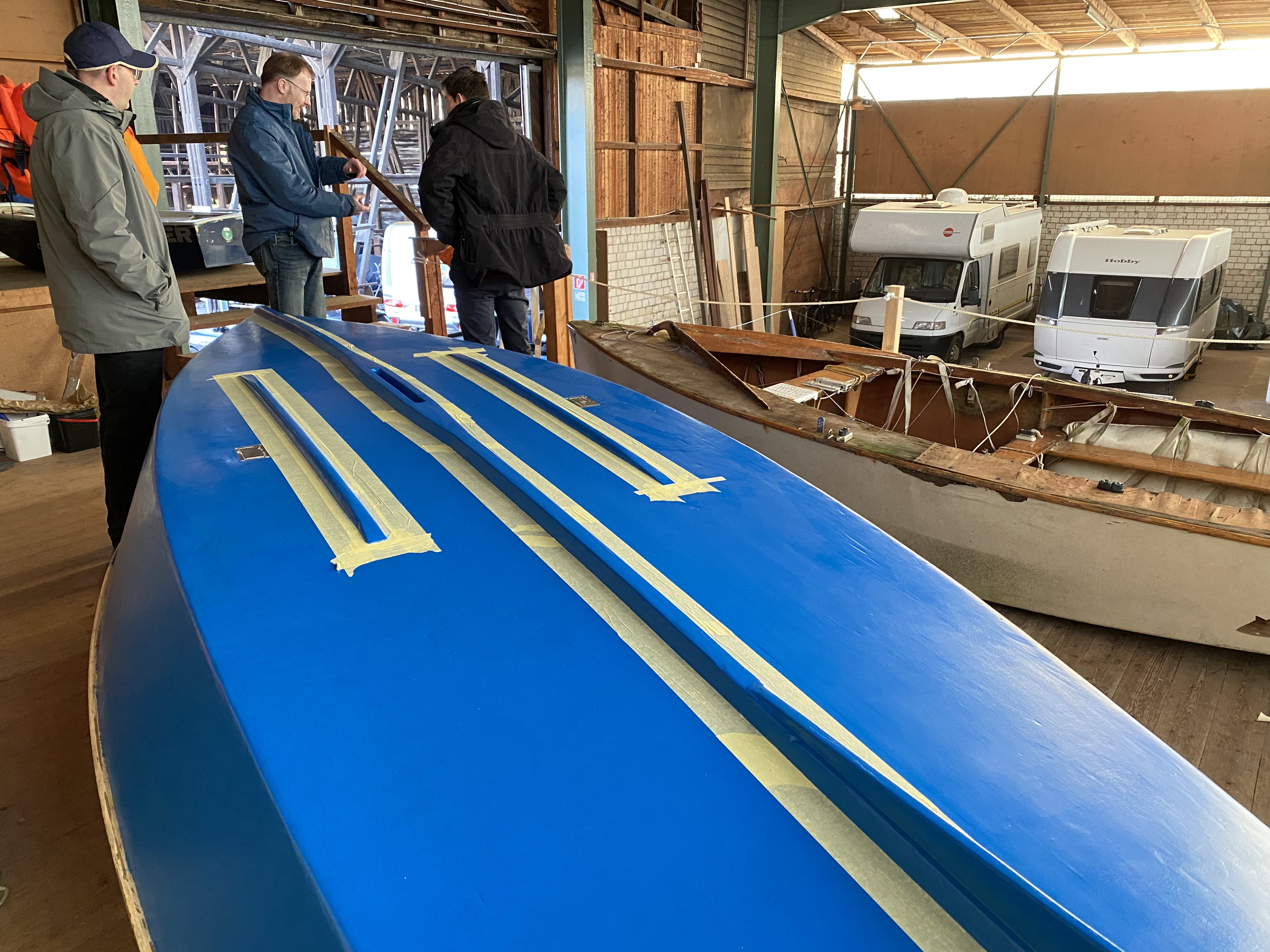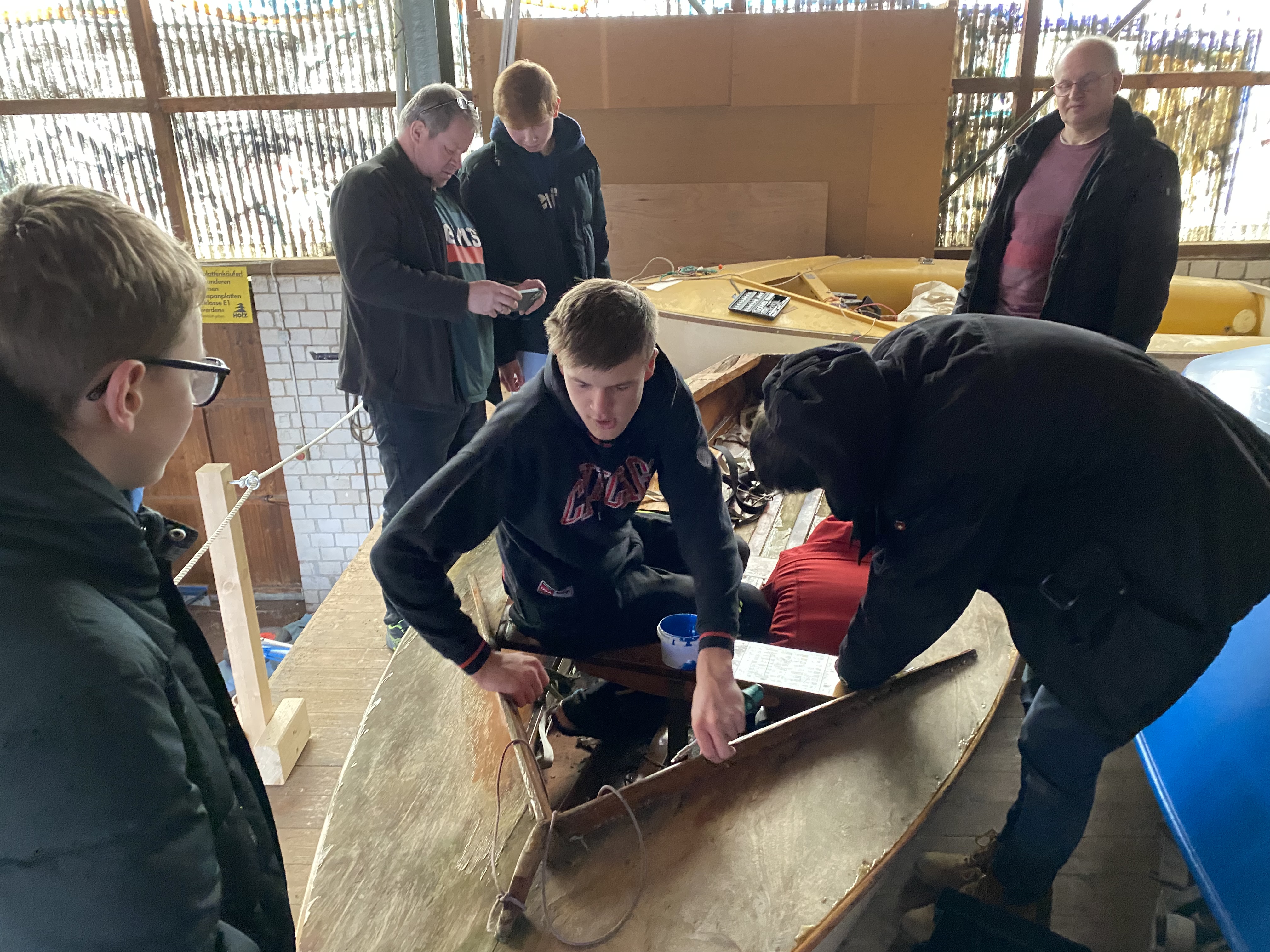 Zwei unserer Schüler haben sich nun an die Arbeit gemacht, um die alte Dame wieder in Schuss zu bringen und dabei vor allem die Beschläge zu erneuern. Jan (Kl. 10) und Max (Kl. 8) aus der Segel AG arbeiten derzeit fleißig daran, unseren blauen Flitzer wieder einsatzbereit zu machen, damit er in der neuen Saison auf „kleine“ Fahrt gehen kann.