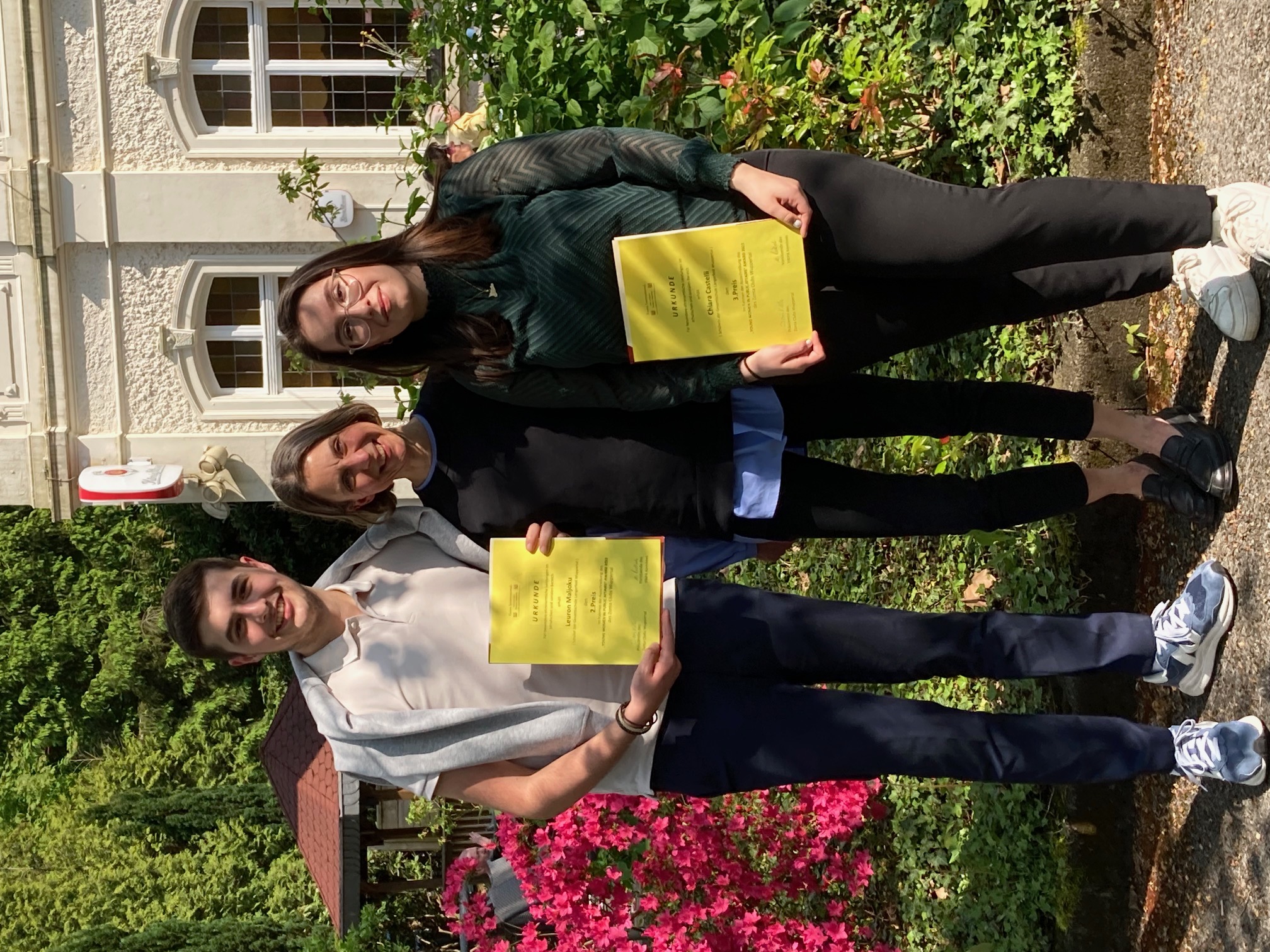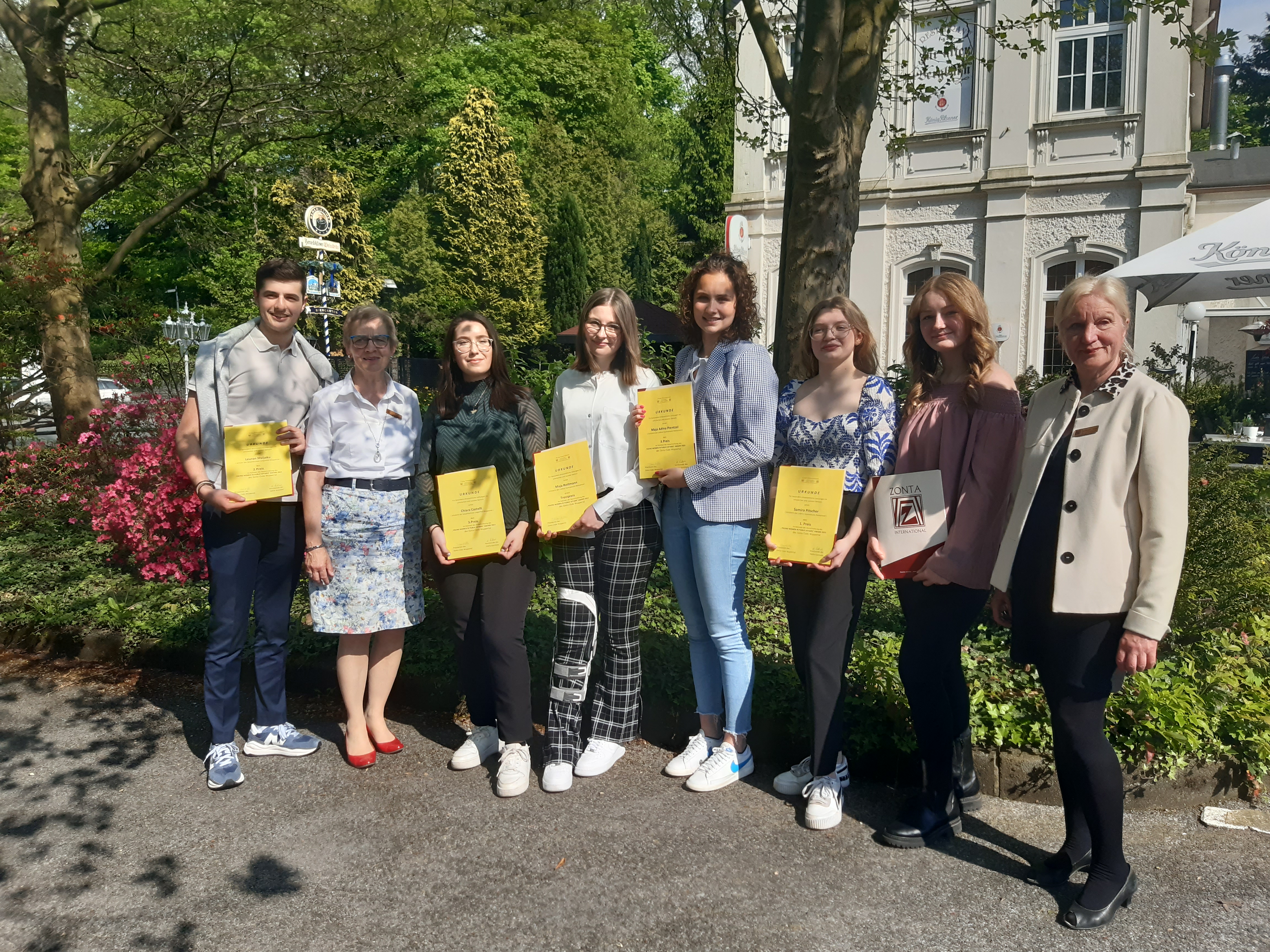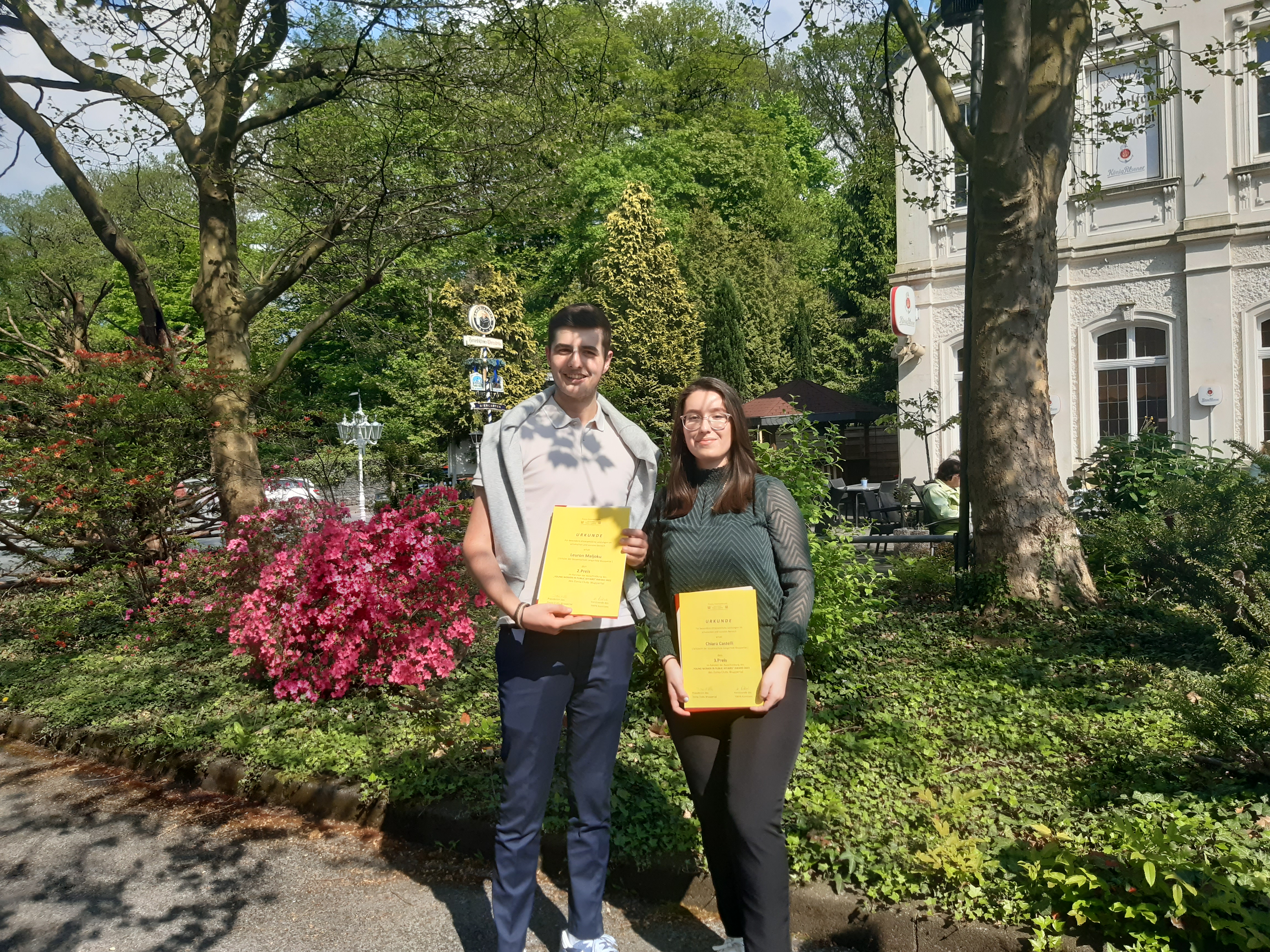 Leuron Maljoku (Q1) gehört in diesem Jahr zu den Preisträgerinnen und Preisträgern des ‚Young Women in Public Affairs Award‘ des Zonta-Club Wuppertal: Im Rahmen der feierlichen Preisverleihung, die am Samstag, 13.5.2023 bei preiswürdigem Wetter im Restaurant „Zur alten Bergbahn“ stattgefunden hat, wurde Leuron der zweite Preis überreicht. Doch das ist noch nicht alles: Auch Chiara Castelli (Q1) durfte sich freuen, denn sie hat den dritten Platz erreicht. Damit ist die Gesamtschule Langerfeld nicht nur mit zwei Schülerinnen und Schülern unter den ersten Plätzen für überdurchschnittliches ehrenamtliches Engagement vertreten, sondern schon zum dritten Mal auf dem Treppchen dabei!