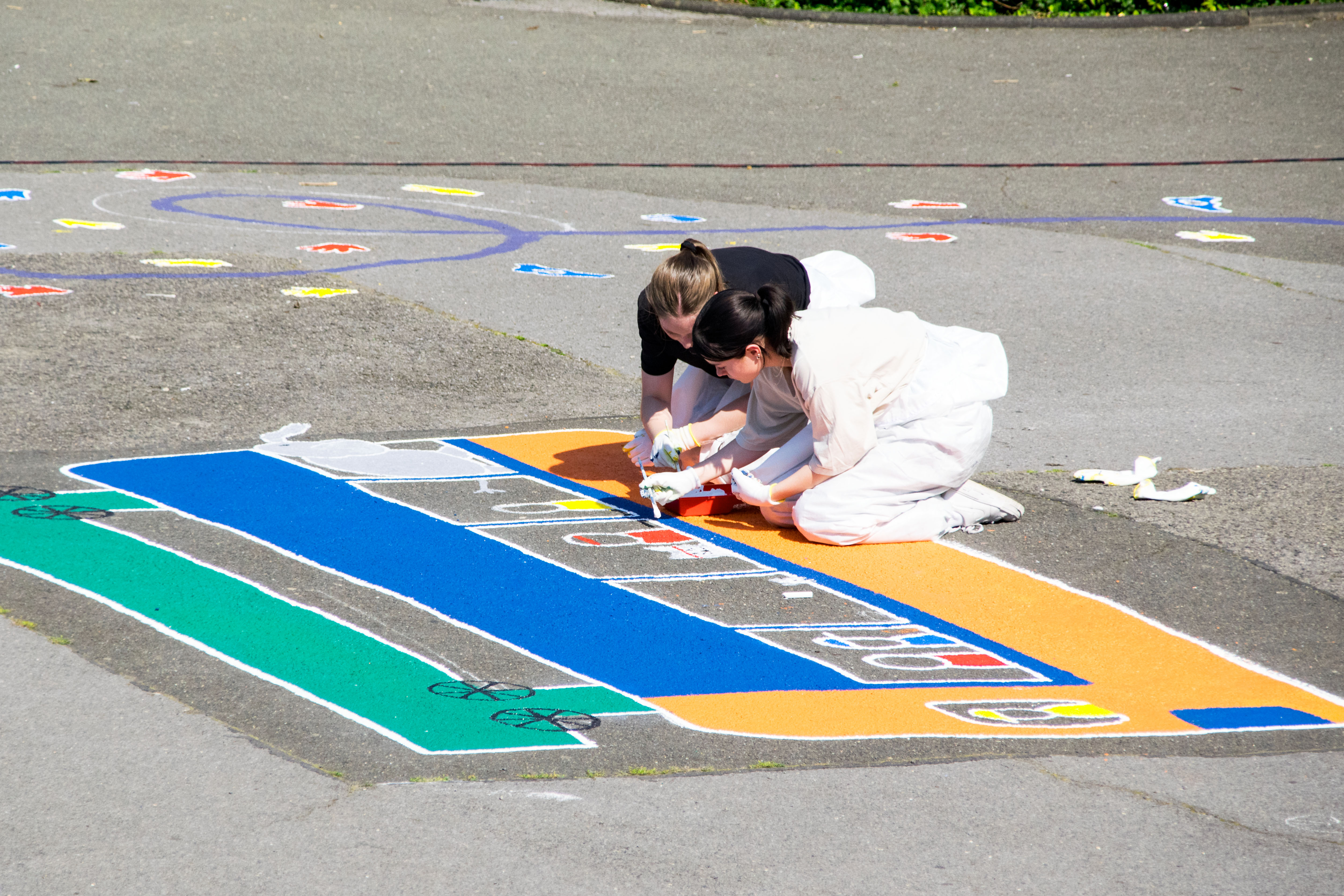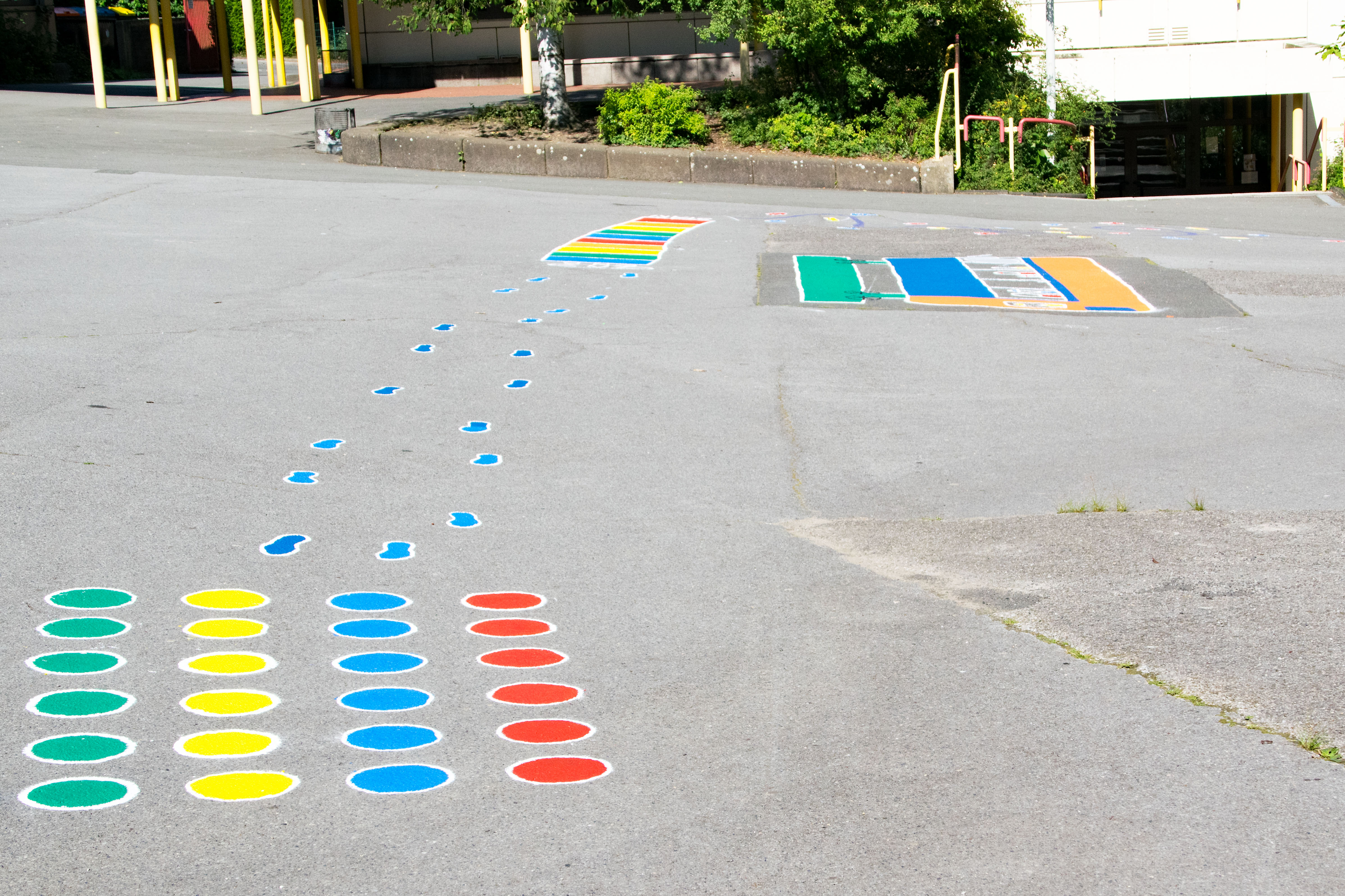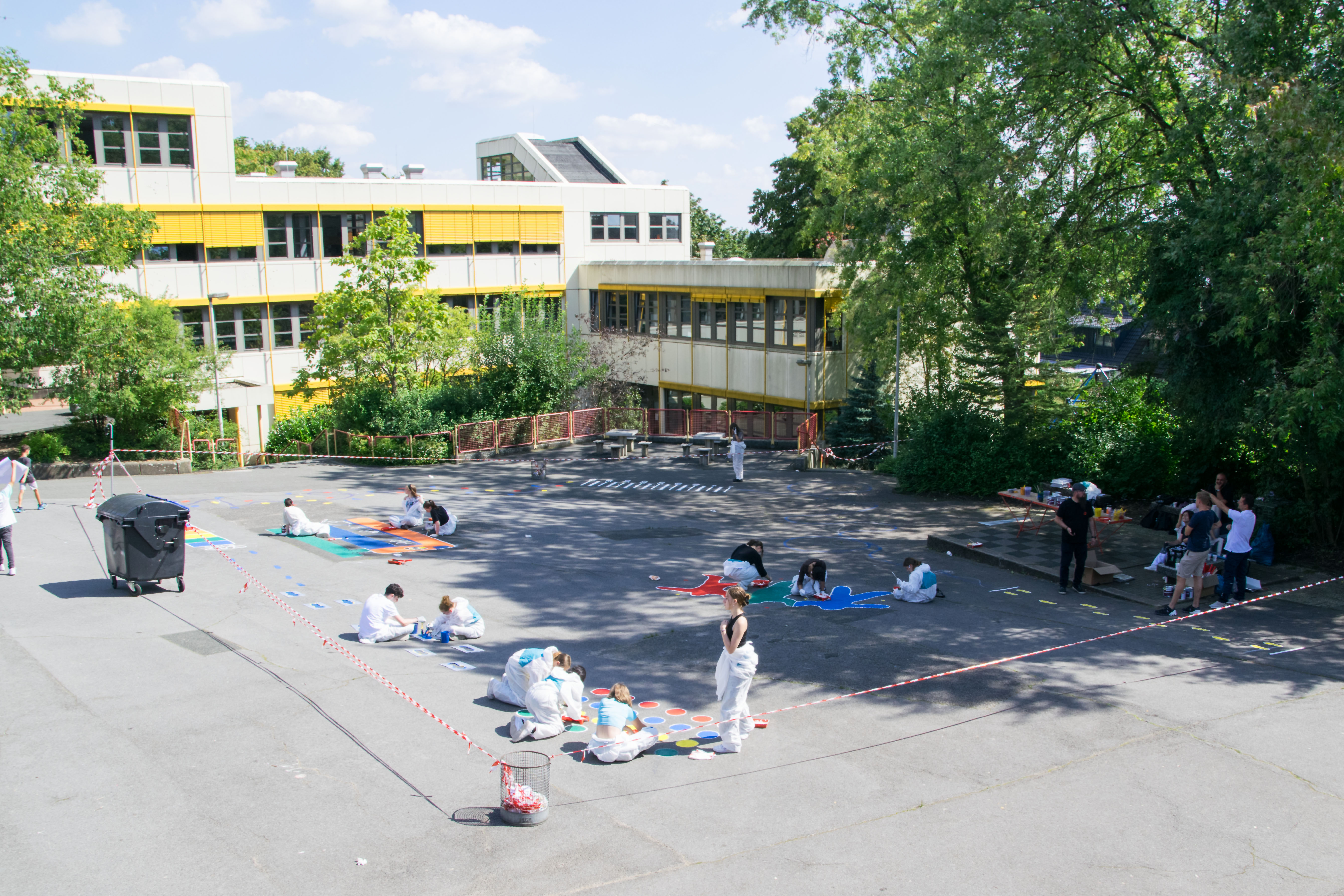 Gemeinsam mit Schülerinnen und Schülern wurden im Vorfeld verschiedene Ideen zur Verschönerung des Schulhofes gesammelt. Im Fokus standen einfach zu realisierende Spiele- und Bewegungsangebote, die dann in einer gemeinsamen Aktion auf dem Schulhof aufgetragen wurden. Nach den Sommerferien konnte das Projekt schließlich konkret umgesetzt werden.