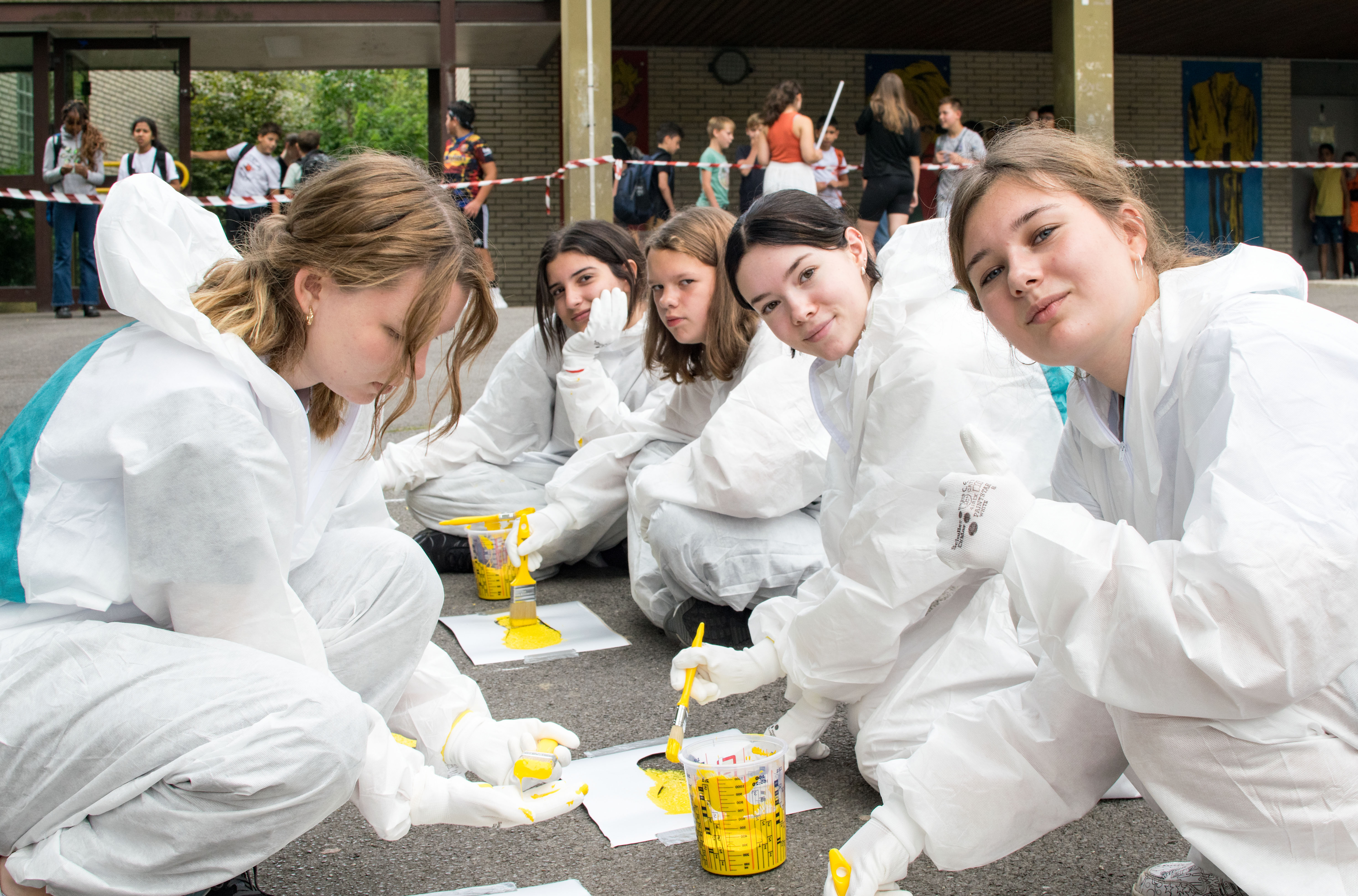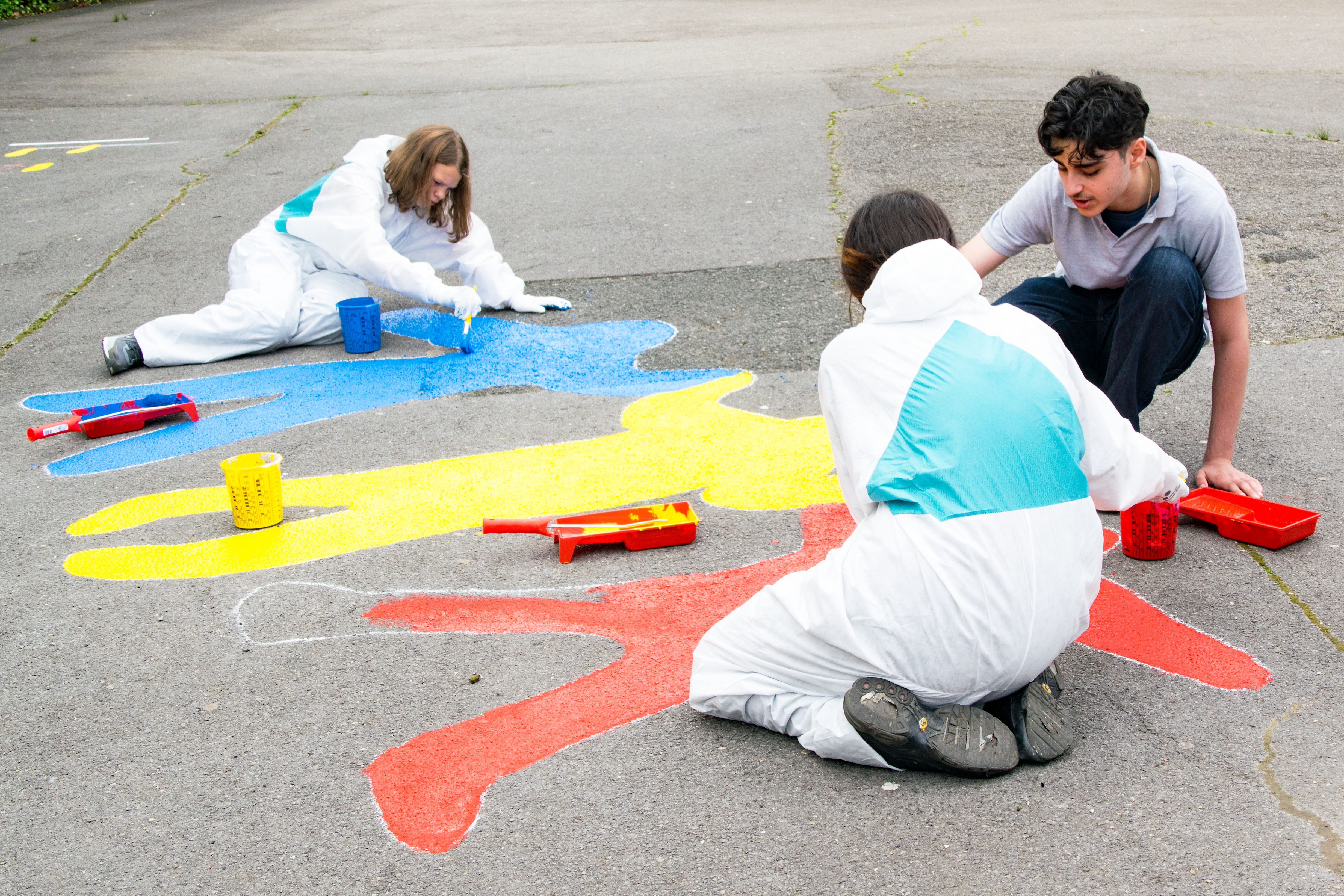 HIND: Das Projekt hat drei Tage in Anspruch genommen, während derer die Schülerinnen und Schüler auf dem Schulhof mit Lackfarben gemalt haben. Dabei wurden sie von professionellen Lackierern unterstützt.