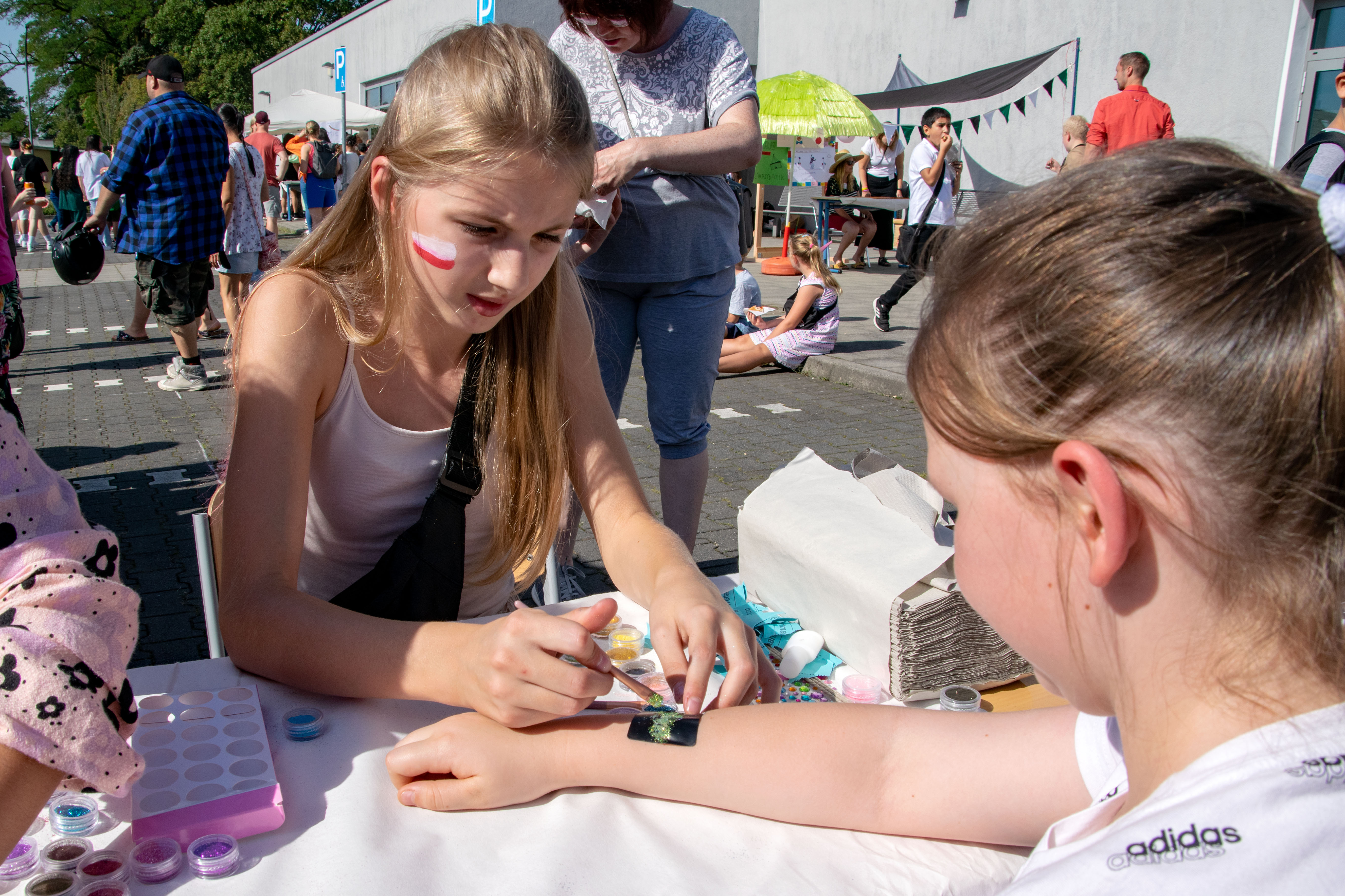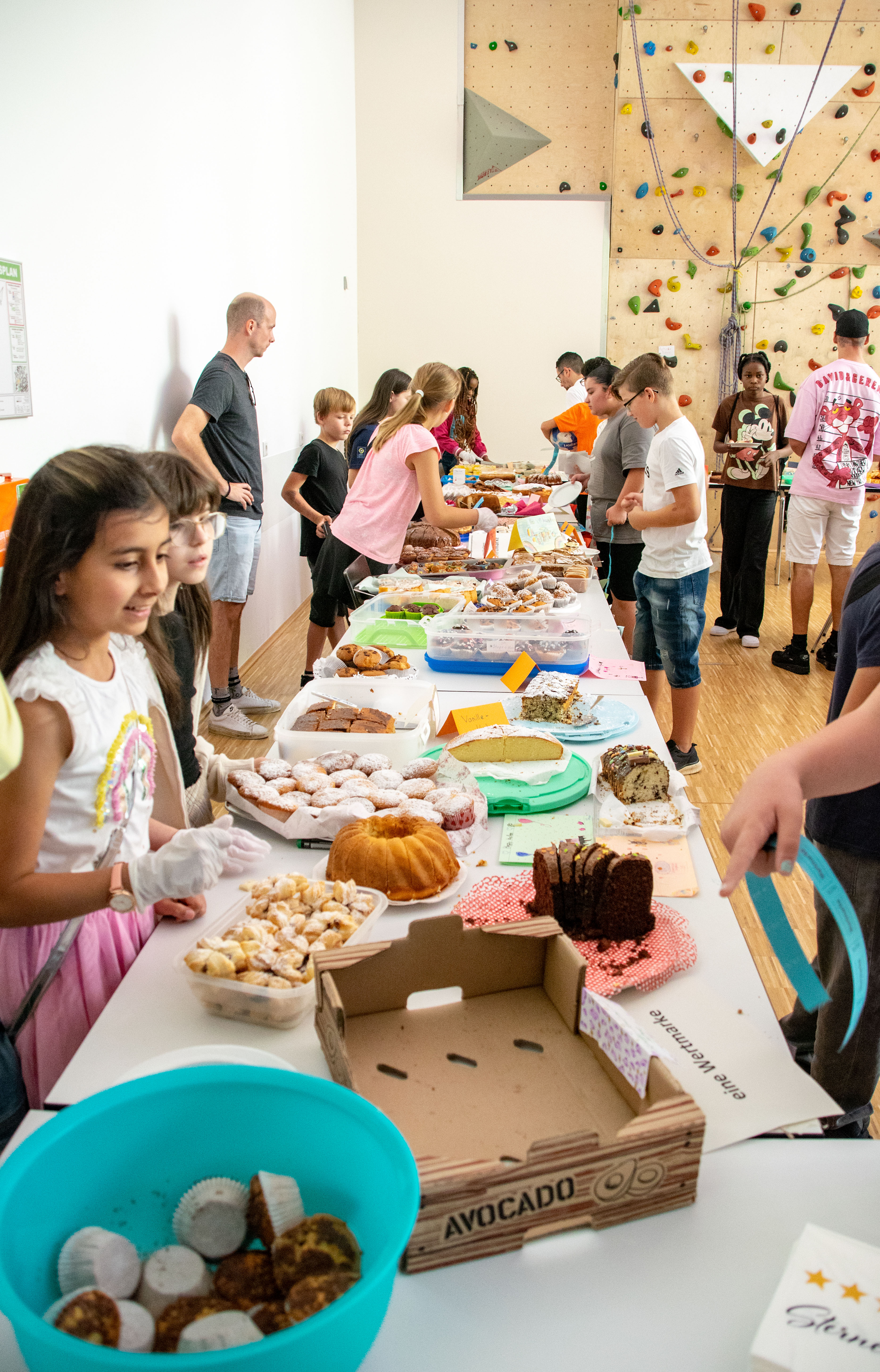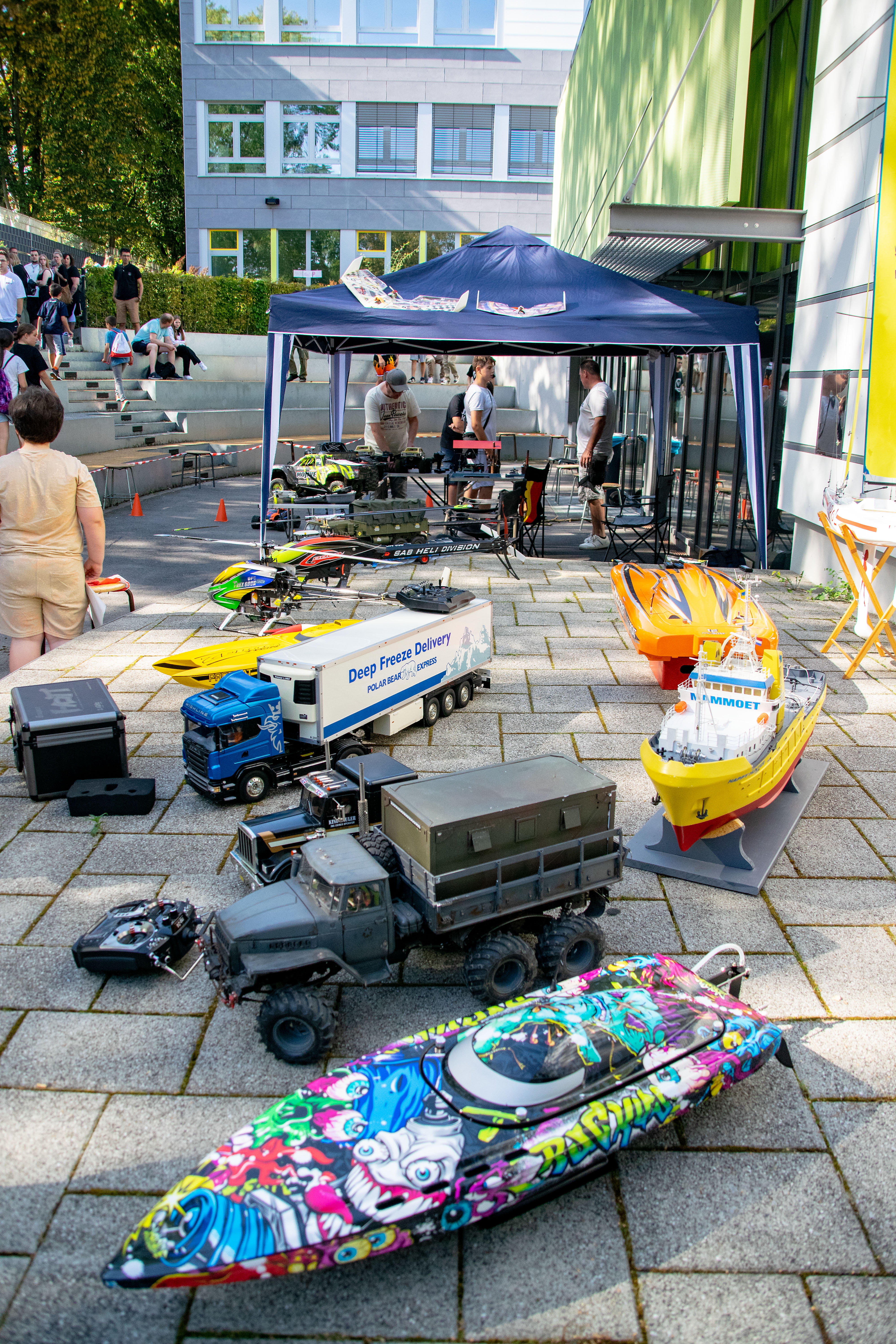 Bei tropischen Temperaturen sorgten der Grill- und der Getränkestand, betreut von der Q2, und die internationalen Köstlichkeiten des 8. Jahrgangs, sowie die Kuchenspezialisten des 5. Jahrgangs für die notwendige Verpflegung. An der Sporthalle warteten aber auch noch Hotdogs und Popcorn. Zirkus, Karaoke, Schminkaktionen, Bodenmalerei und die Modellautos der Modellbau-AG begeisterten das Publikum.