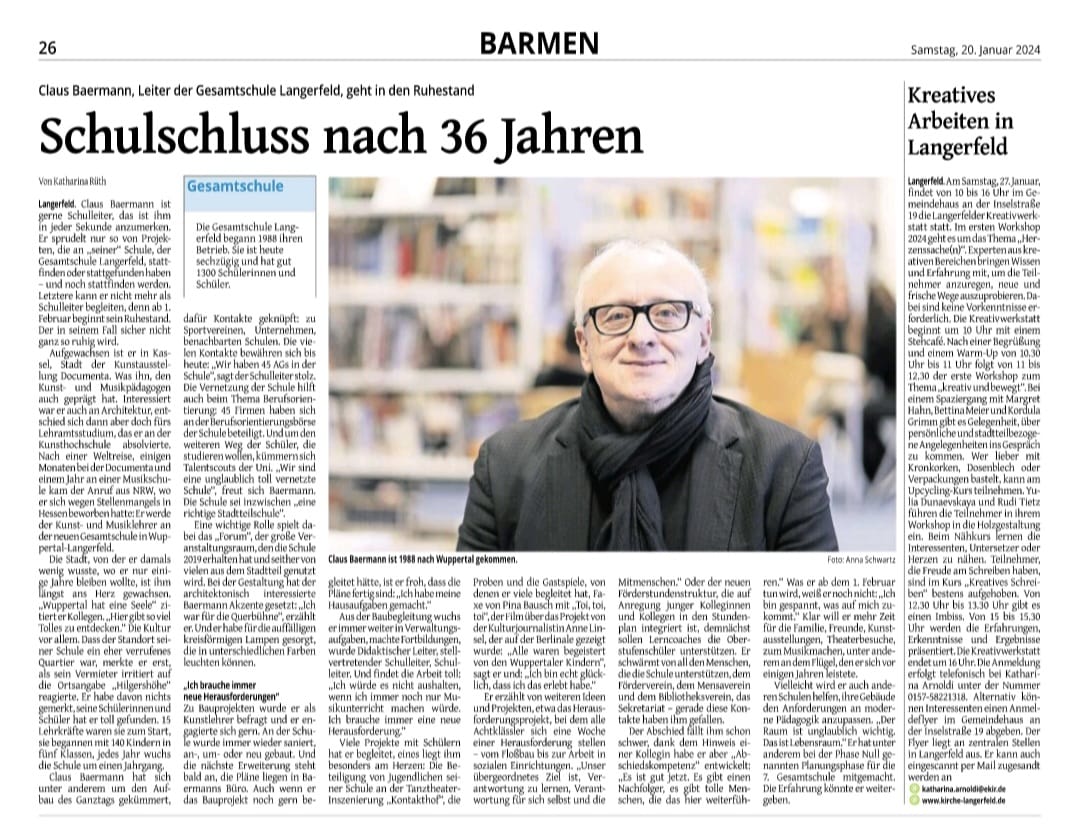 Claus Baermann ist gerne Schulleiter, das ist ihm in jeder Sekunde anzumerken. Er sprudelt nur so von Projekten, die an „seiner“ Schule, der Gesamtschule Langerfeld, stattfinden oder stattgefunden haben – und noch stattfinden werden. Letztere kann er nicht mehr als Schulleiter begleiten, denn ab 1. Februar beginnt sein Ruhestand. Der in seinem Fall sicher nicht ganz so ruhig wird.