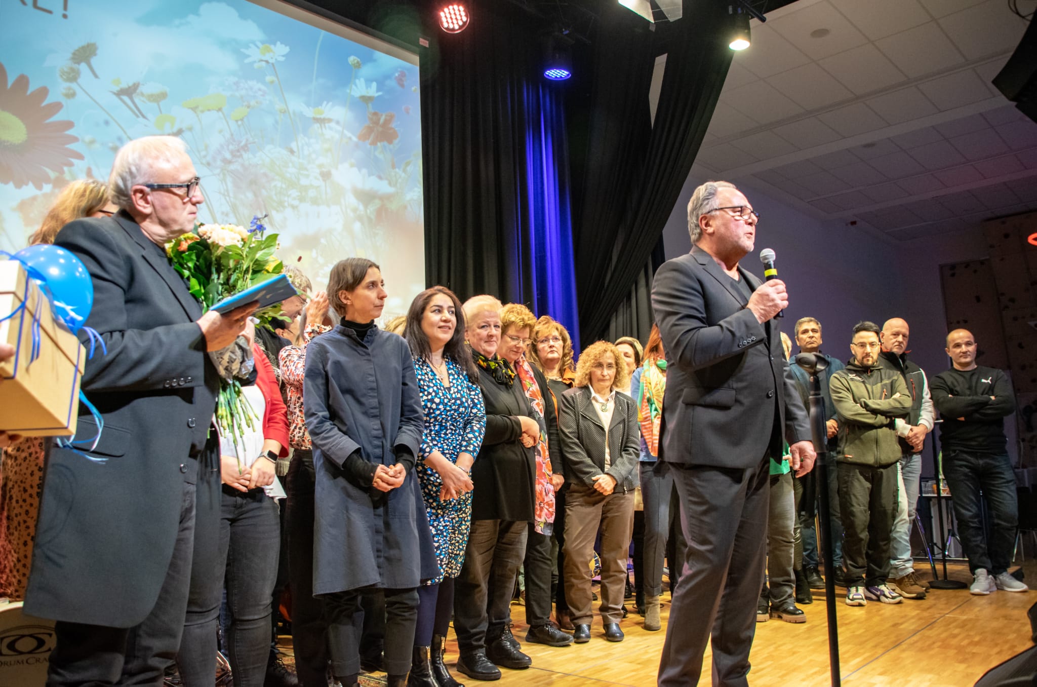 Ein einprägsames Bild ergab sich im Anschluss, als zunächst die Mitglieder des gesamten Kollegiums in der Reihenfolge des Eintrittsalters jeweils eine Blume an Claus Baermann überreichten, gefolgt von den Mitgliedern der Schulleitung, Anna Orlich, Tobias Wiegold, Janine Don-Hölscher, Marius Moldenhauer und Andreas Rosenberg, die ein weiteres Präsent mit persönlichen Grüßen überreichten. Andreas Rosenberg, der die Moderation der Verabschiedung übernommen hatte, richtete zum Abschluss persönliche Worte an Claus Baermann und bedankte sich speziell im Namen der Schulleitung für die gute Zusammenarbeit in den letzten Jahren.