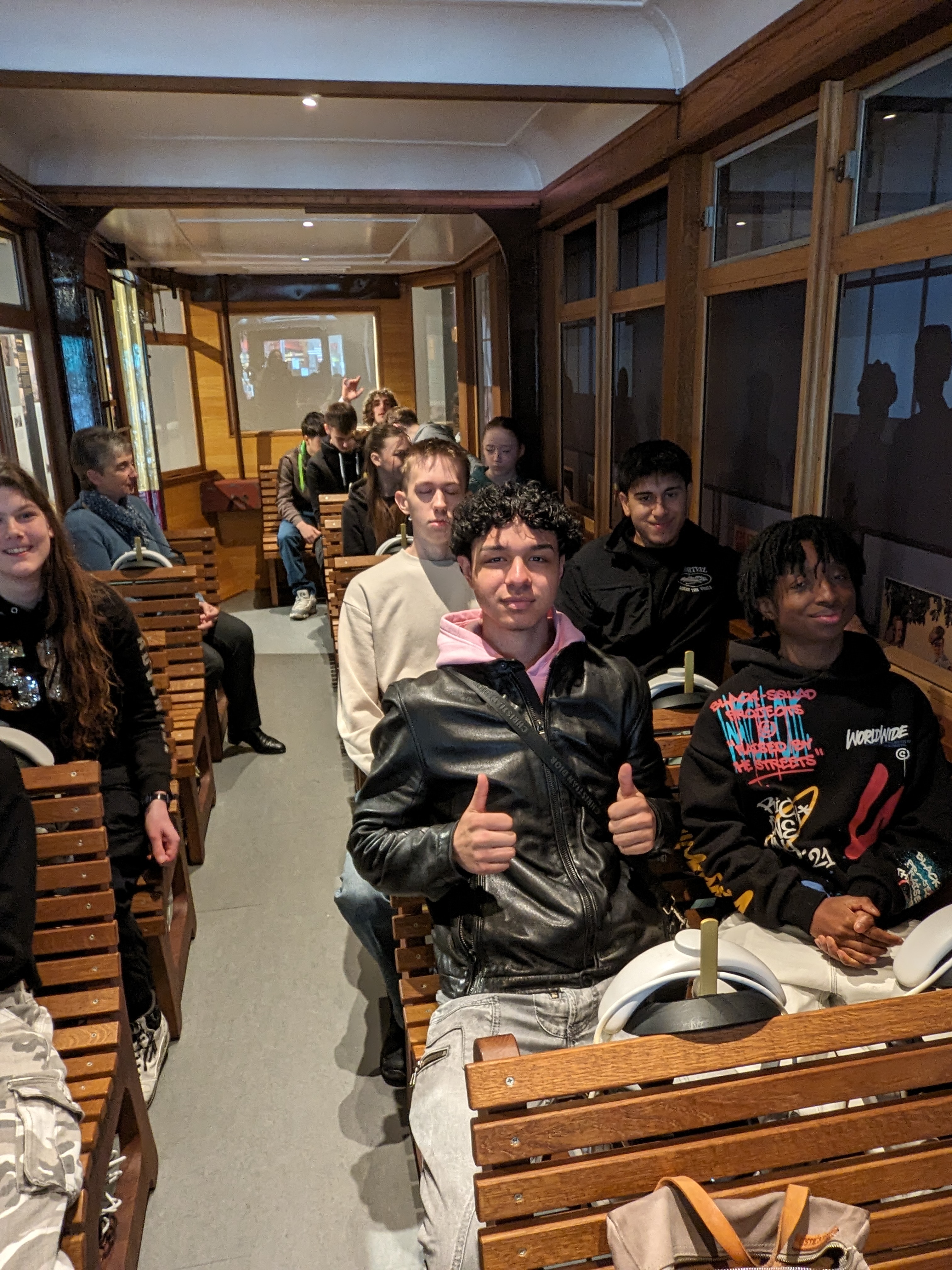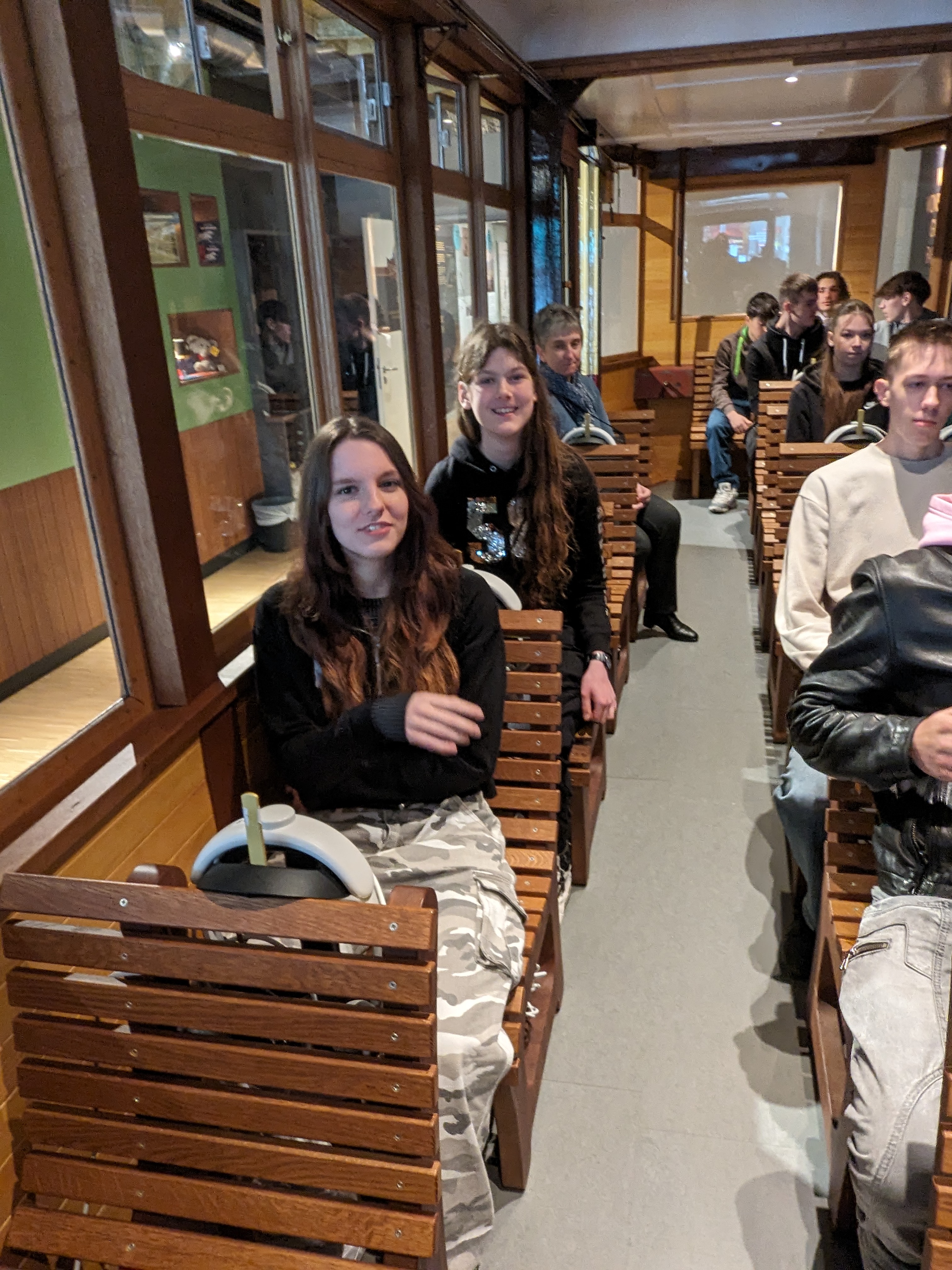 Zum Schluss gab es eine VR-Tour, bei der wir von Oberbarmen bis nach Vohwinkel im Jahre 1929 fuhren. Es fühlte sich sehr realistisch an und wir können es nur allen empfehlen einmal dorthin zu gehen. Wir saßen mit unseren VR-Brillen im Kaiserwagen und fuhren an vielen Gebäuden der Stadt vorbei, die wir heute nicht mehr haben und ebenfalls an solchen, die man durchaus wieder erkannt hat.