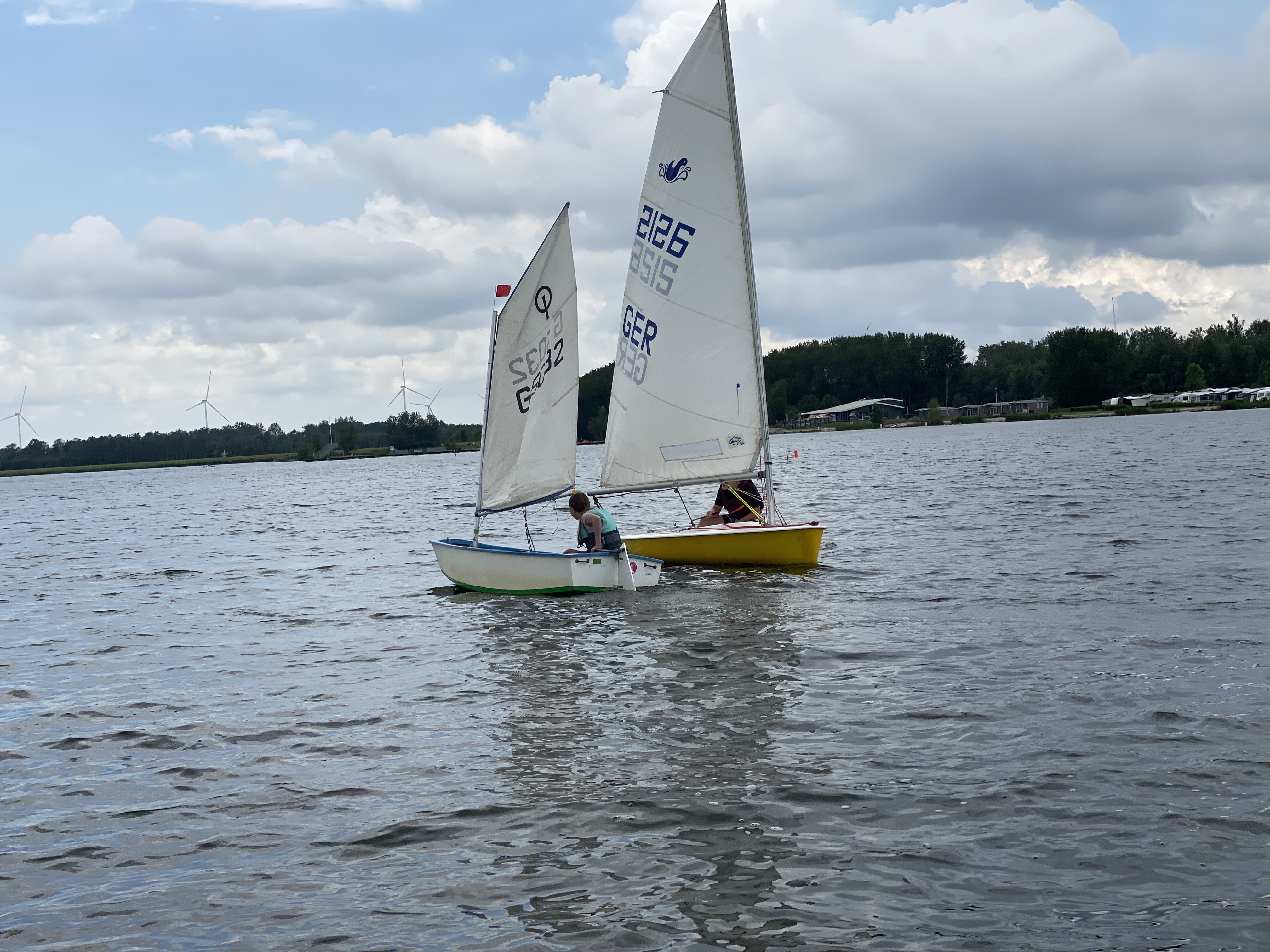 Wem das nicht reicht, der fährt zusammen mit anderen Seglerinnen und Seglern am Wochenende zu Regatten oder in den Sommerferien sogar zu den Weltmeisterschaften nach Portugal (2022), Frankreich (2023) oder in diesem Jahr in die Slowakei. Eine besondere Aktion ist unsere jährliche Segelfortbildung in den Niederlanden am Veluwemeer. Dieses Jahr jährte sich diese Veranstaltung zum 30. Mal. Unter Leitung von Wolfgang Möller und unter Mithilfe von Eltern, ehemaligen Schülerinnen und Schülern sowie Vereinsmitgliedern des USCB fahren in der Regel ca. 50 kleine und große Seglerinnen und Segler für 5 Tage über Fronleichnam nach Bremerbergse Hoek, um dort das Segeln zu perfektionieren. Dabei steht der Spaß für alle im Vordergrund, den Umgang mit Wind und Wasser, Verantwortung für sein Schiff und andere zu übernehmen, Respekt vor der Natur und gleichzeitig mögliche Angst zu überwinden.