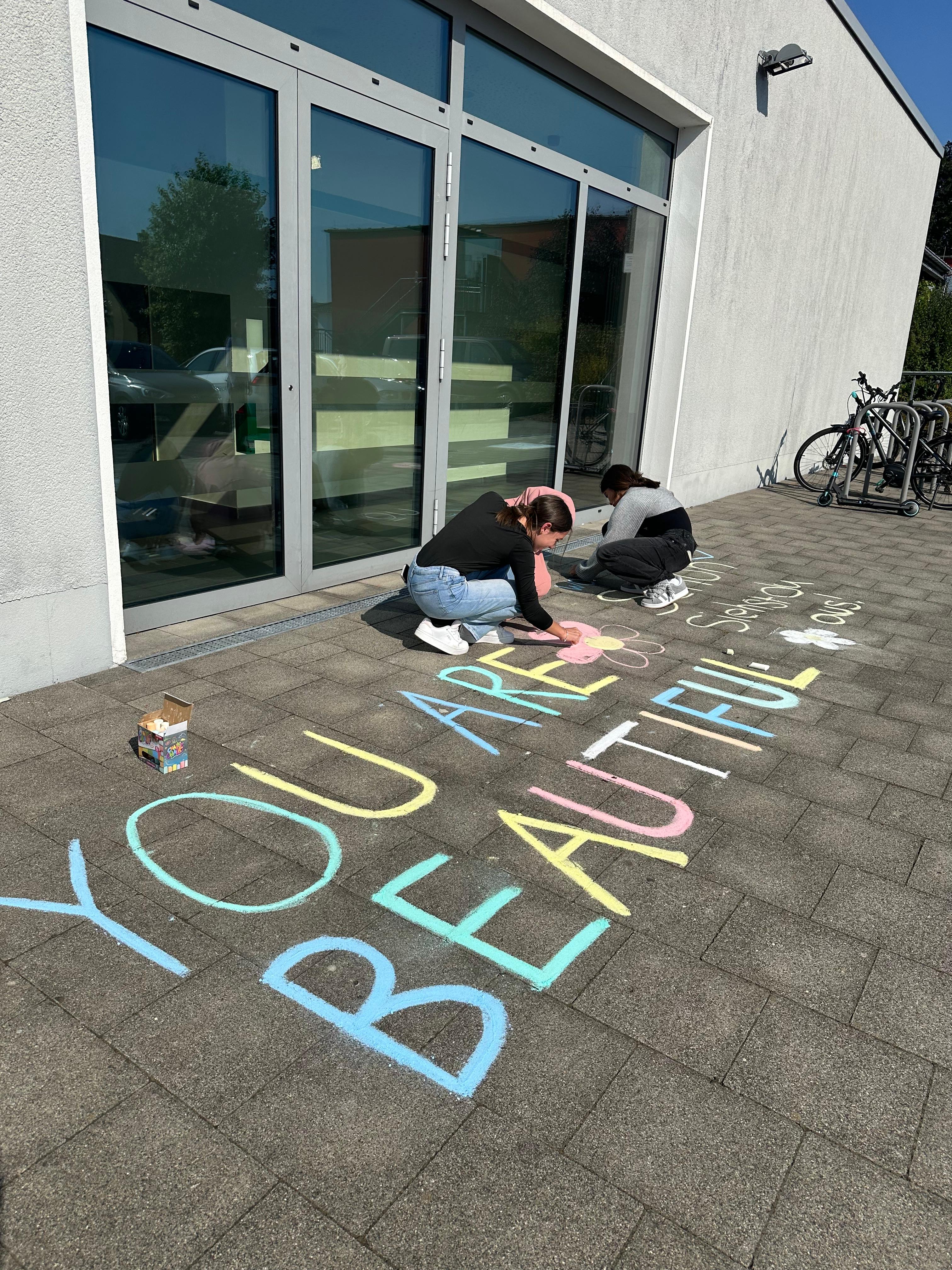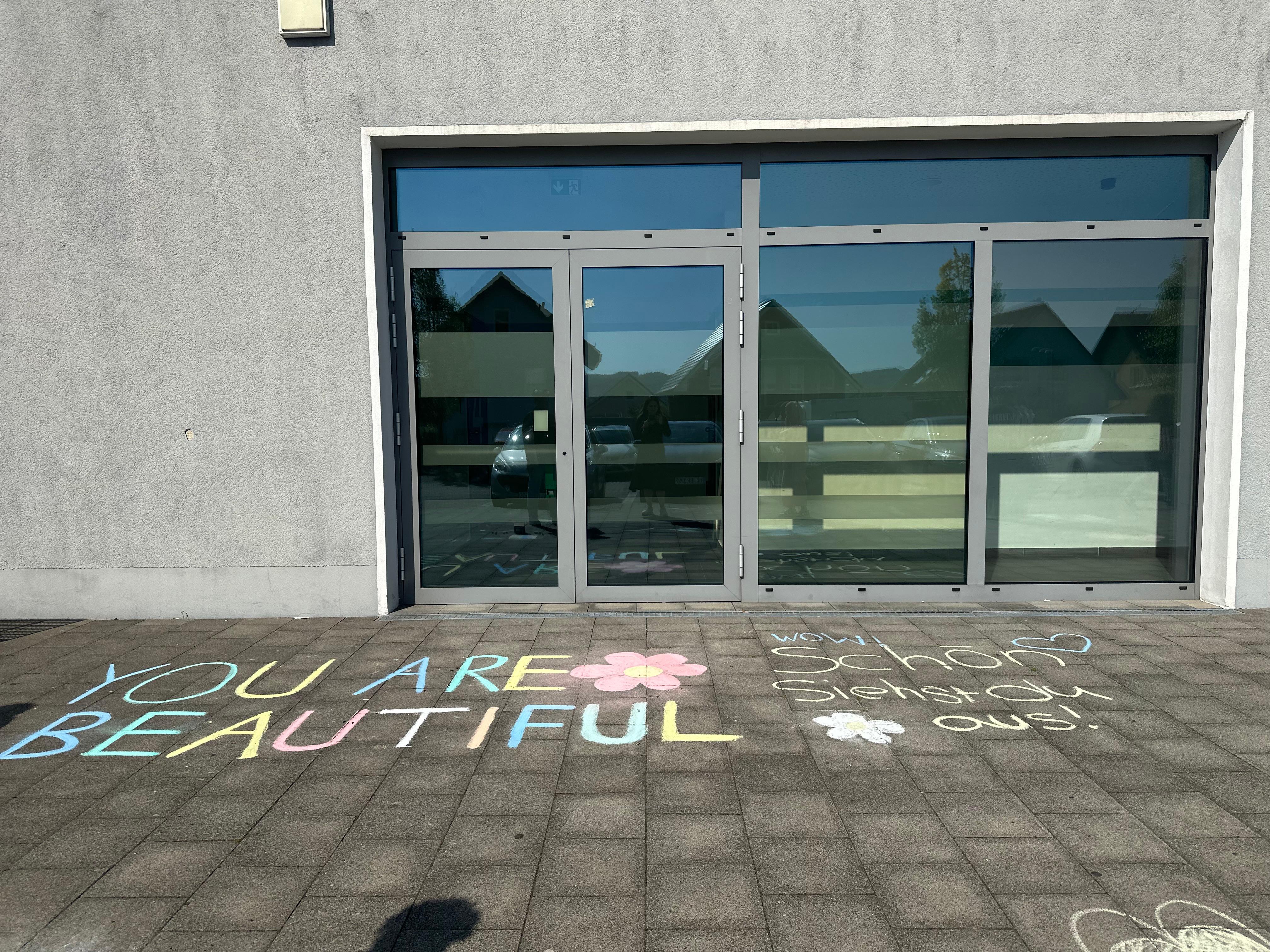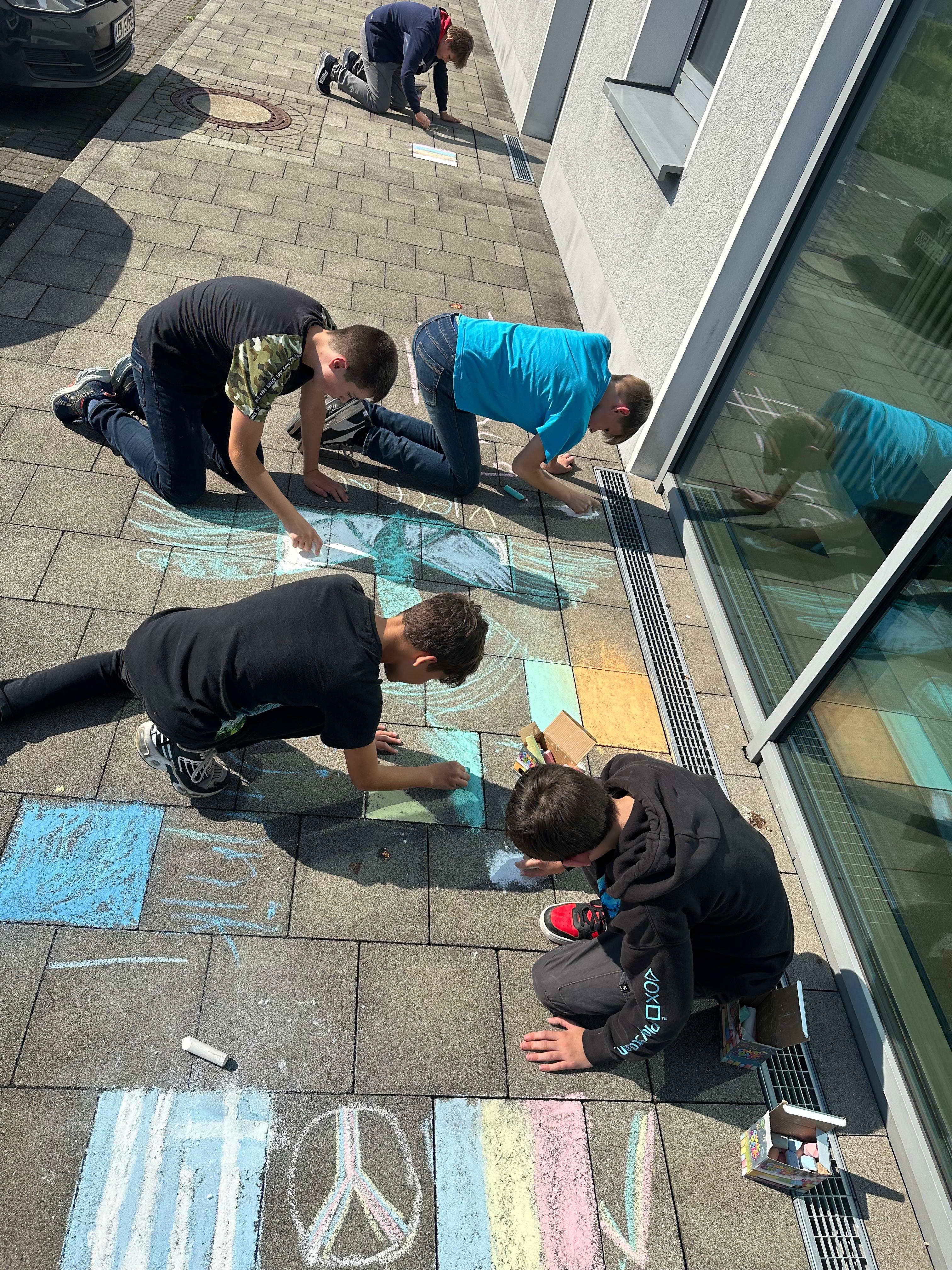 Auf dem Schulhof haben Schülerinnen und Schüler mit bunter Kreide Kunstwerke geschaffen, die das Thema Vielfalt aufgreifen. Besonders beeindruckend war ein großes Gruppenfoto, bei dem Schülerinnen und Schüler viele bunte Jacken trugen. Auf dem Boden dazu passend sieht man einen selbstgestalteten Spruch in leuchtenden Kreidefarben, der unser Bekenntnis zur Toleranz unterstreicht.