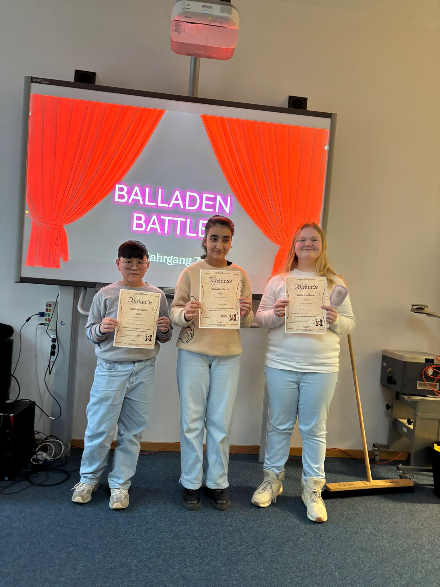 In der Vorrunde des Wettstreits wurden klassenintern die Sieger*innen ermittelt. Dabei gab es drei Kategorien, drei Klassiker der Balladen-Kunst: „Die Lore-Ley“ von Heinrich Heine, „Erlkönig“ und „Der Zauberlehrling“, beides von Johann Wolfgang von Goethe. Im großen Balladen-Battle Mitte Dezember traten dann die Klassensieger*innen in der Schul-Bibliothek gegeneinander an. Nicht nur das Publikum, bestehend aus einzelnen Mitschüler*innen, sondern auch die Teilnehmer*innen waren begeistert von der Stimmung und den Vorträgen. Yousef aus der 7A war sehr überrascht darüber, wie gut alle vorgetragenen Balladen waren und freute sich deshalb auch darüber, dass alle einen kleinen Preis bekamen. Und auch von seiner Mitschülerin Mirella gab es eine positive Rückmeldung und der Wunsch, dass jeder 7. Jahrgang ein Balladen-Battle veranstalten sollte, damit auch anderen Kindern die Möglichkeit geboten würde, sich auf dieses abwechslungsreiche Weise zu beweisen.