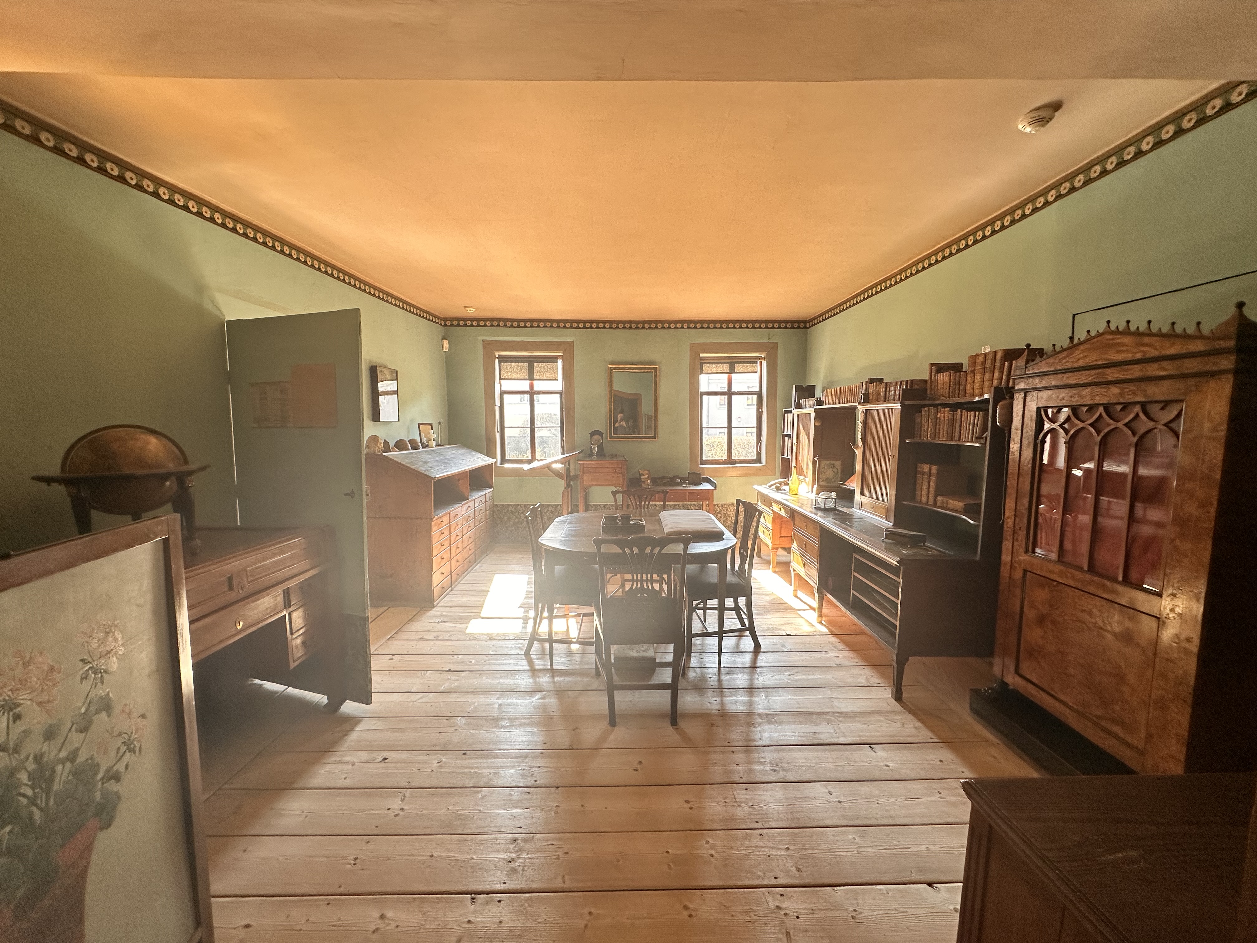 Am Folgetag tauchten wir in das kulturelle Erbe Weimars ein: Wir besuchten Goethes Wohnhaus und das Goethe-Nationalmuseum. Im Museum erfuhren wir viel über Goethes Leben, seine Interessen und seine Arbeitsweise. Besonders eindrucksvoll war die originalgetreue Gestaltung der Räume in seinem Wohnhaus, die einen authentischen Einblick in seine Lebenszeit und Persönlichkeit ermöglichten. Sein Arbeitszimmer stach dabei besonders hervor, da es auf subtile Weise die Atmosphäre seines kreativen Schaffens widerspiegelt. Im weiteren Verlauf des Tages konnten wir verschiedene Angebote wahrnehmen und weitere kulturelle Orte besuchen – darunter Goethes Gartenhaus, das Museum Neues Weimar und das Bauhaus-Museum. Diese Besuche ermöglichten uns, noch tiefer in die Kultur Weimars einzutauchen – auch auf Grundlage unserer individuellen Interessen. Am Nachmittag besuchten wir die Herzogin Anna Amalia Bibliothek, eine bedeutende historische und moderne Bestandsbibliothek mit rund einer Million Büchern. Trotz eines verheerenden Brandes im Jahr 2004 beherbergt sie heute wieder zahlreiche wertvolle Werke. Die beeindruckende Architektur im Rokokostil sowie die historischen Bücher aus verschiedenen Epochen faszinierten uns besonders.