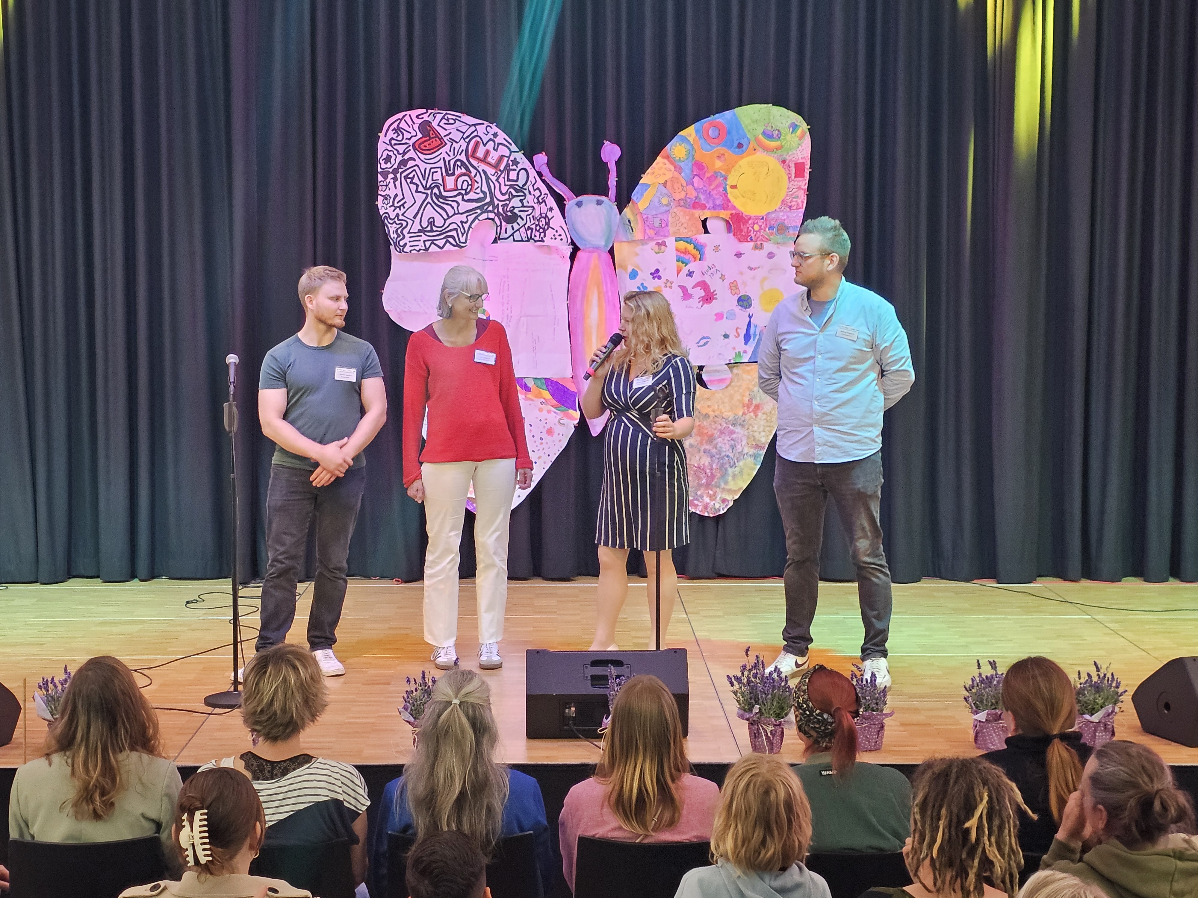 Die jetzigen 5. Klassen hatten ein buntes Begrüßungsprogramm vorbereitet, das mit Musik, Tanz und kleinen Szenen nicht nur für gute Stimmung, sondern auch für fröhliche Gesichter im Publikum sorgte. Auch Beiträge aus verschiedenen Arbeitsgemeinschaften bereicherten das Programm und gaben einen ersten Einblick in das vielfältige Schulleben an der Gesamtschule Langerfeld. Zudem stellte sich das Beratungsteam der Abteilung I vor: Frau Don-Hölscher (Abteilungsleiterin), Herr Diekmann (Beratungslehrer), Frau Bolder (Beratungslehrerin), Herr Bielstein (Sozialpädagoge) und Frau Euteneuer (Sonderpädagogin).