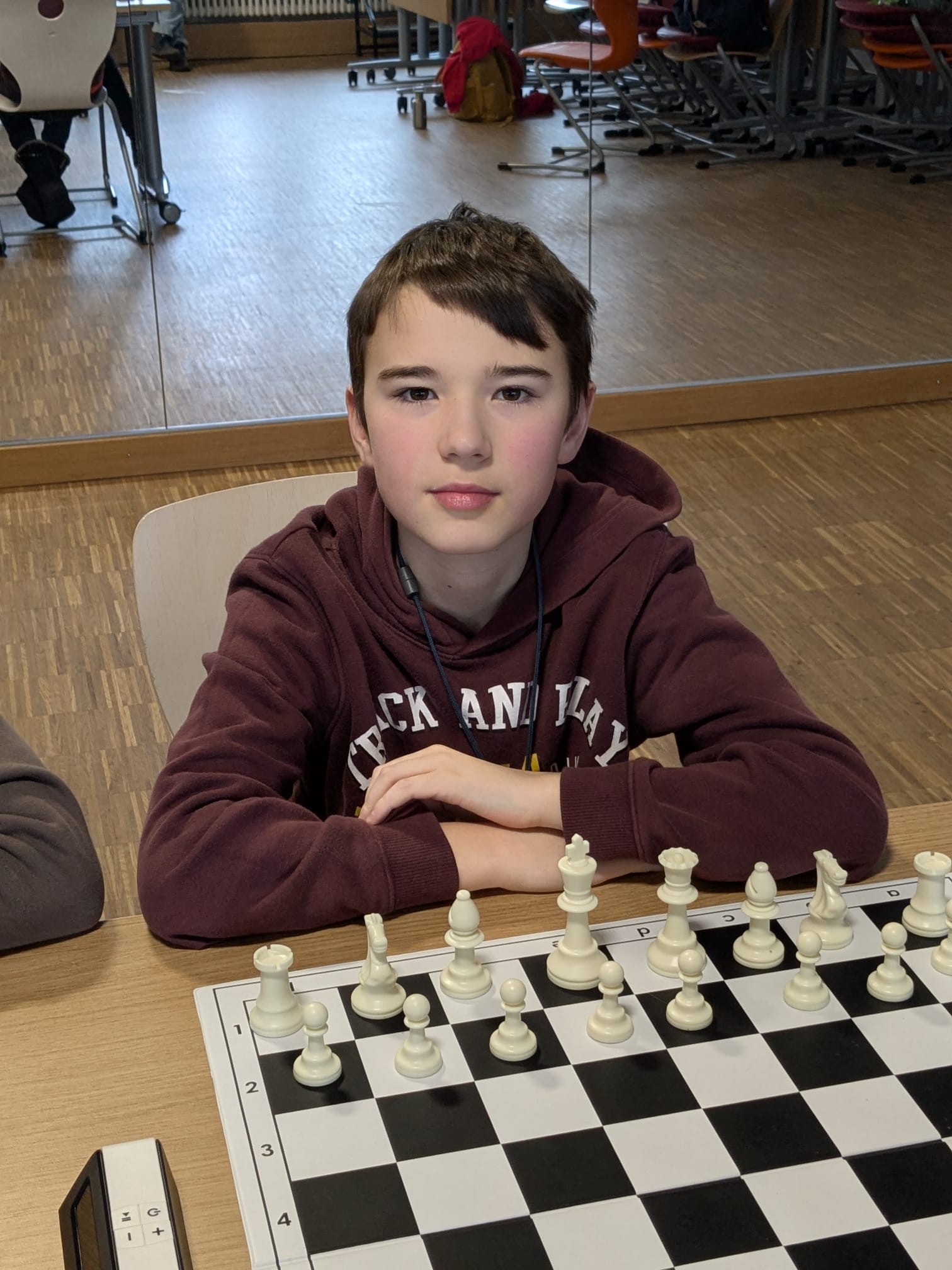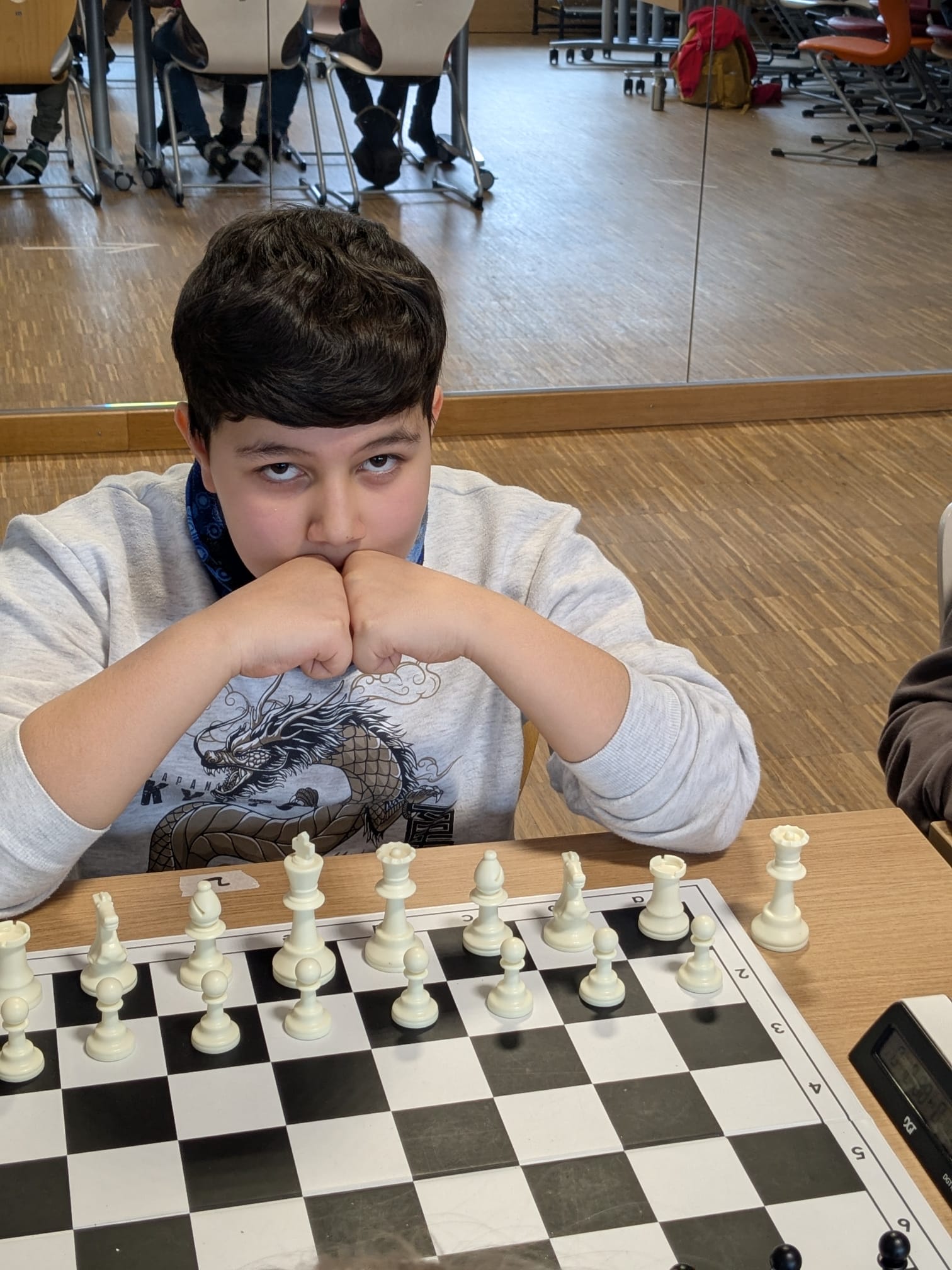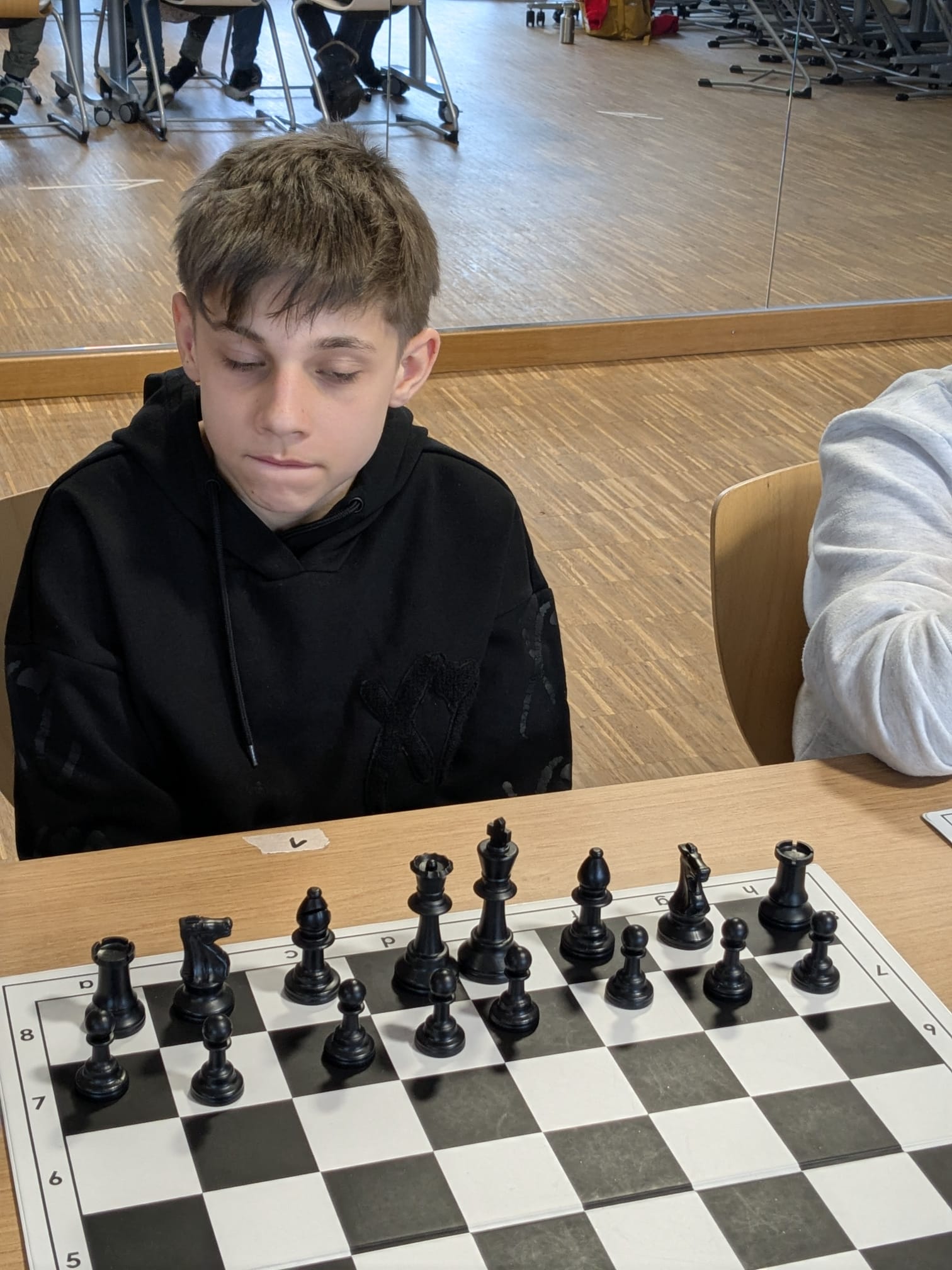 Der Auftakt war für beide Mannschaften alles andere als ideal. Auch für die 1. Mannschaft gab es durch die 1:3 Niederlage eine herbe Enttäuschung. Im weiteren Turnierverlauf steigerte sich das Team und trat schließlich gegen den Erstrundengegner im Stechen um den Einzug ins Halbfinale an. Durch eine überzeugende Teamleistung gelang diesmal eine 4:0 Revanche. Hierbei sei hervorzuheben, dass Justus‘ Gegner bereits seit 6 Jahren aktiv Schach spielt! Das Halbfinale war an Spannung nicht zu überbieten. Nachdem Justus unsere Mannschaft souverän in Führung brachte, musste Leon am 4. Brett seine erste und einzige Niederlage einstecken. Natan erkämpfte ein starkes Remis während Alex versuchte, den Mannschaftssieg zu sichern. Leider unterlag er letztendlich in einer stark umkämpften Partie, die bis zum Schluss auf des Messers Schneide stand. So bitter kann Schach sein! Trotzdem können wir stolz auf diese Mannschaft sein, die das Finale nur denkbar knapp verpasst hat.