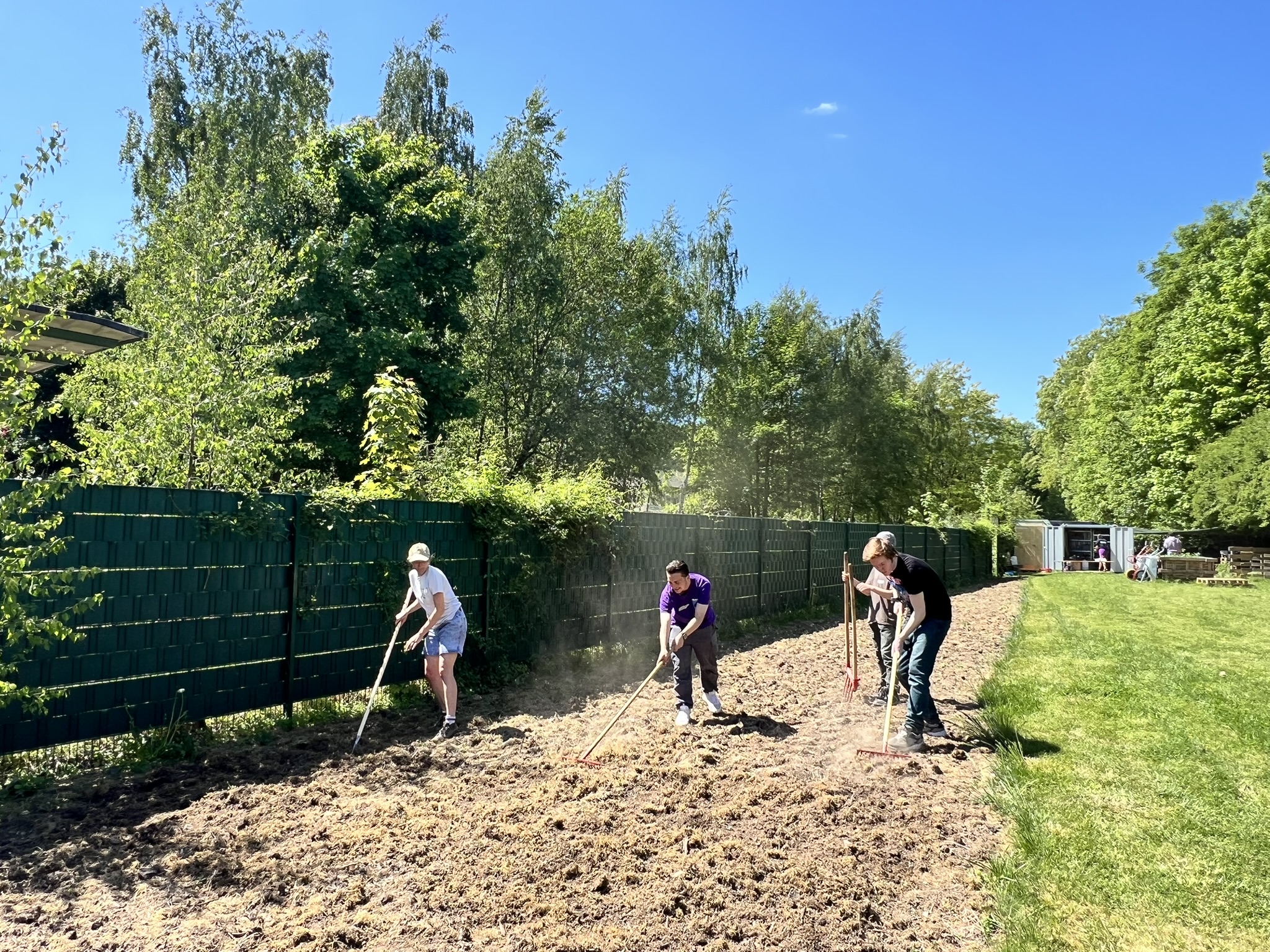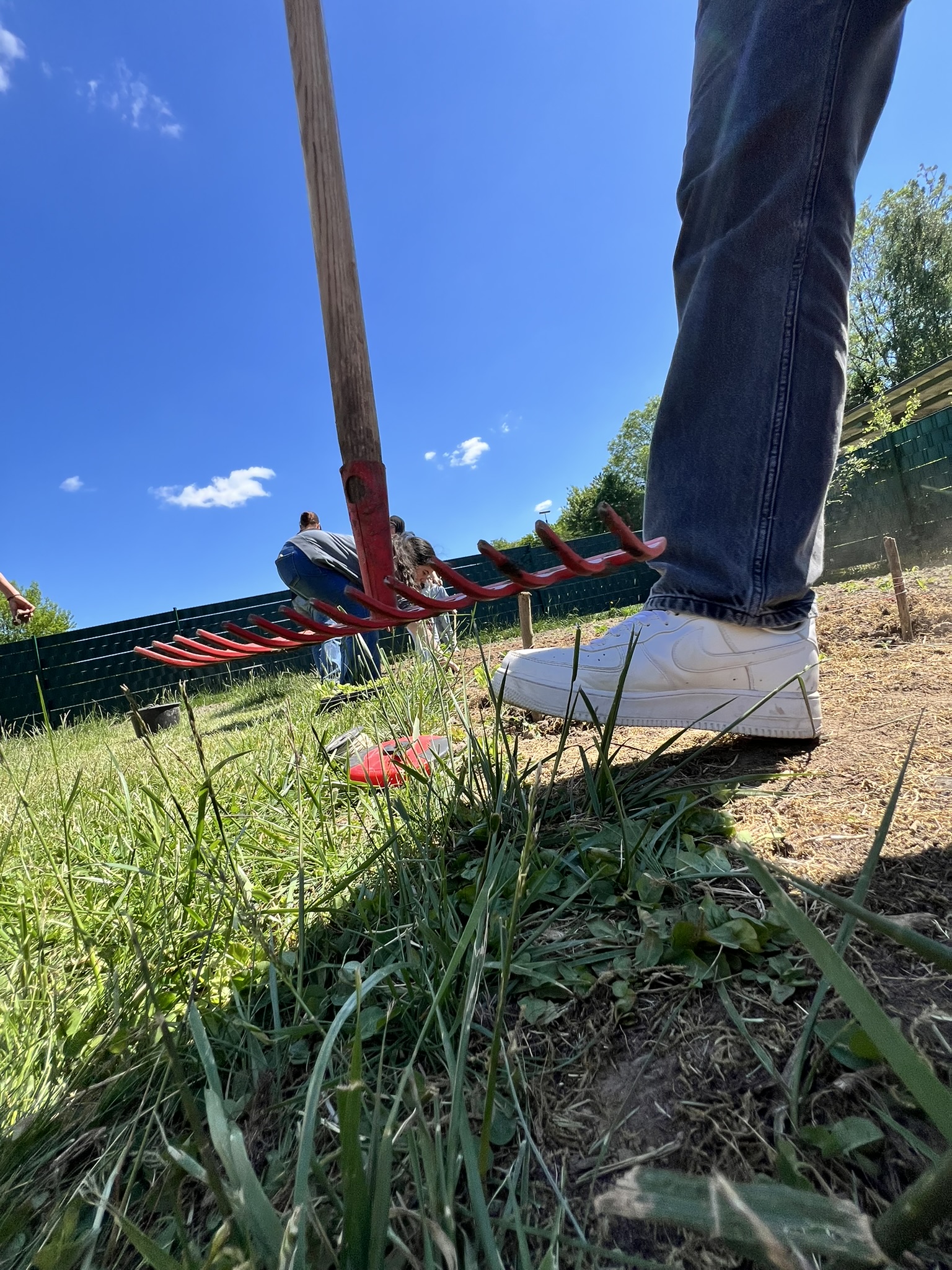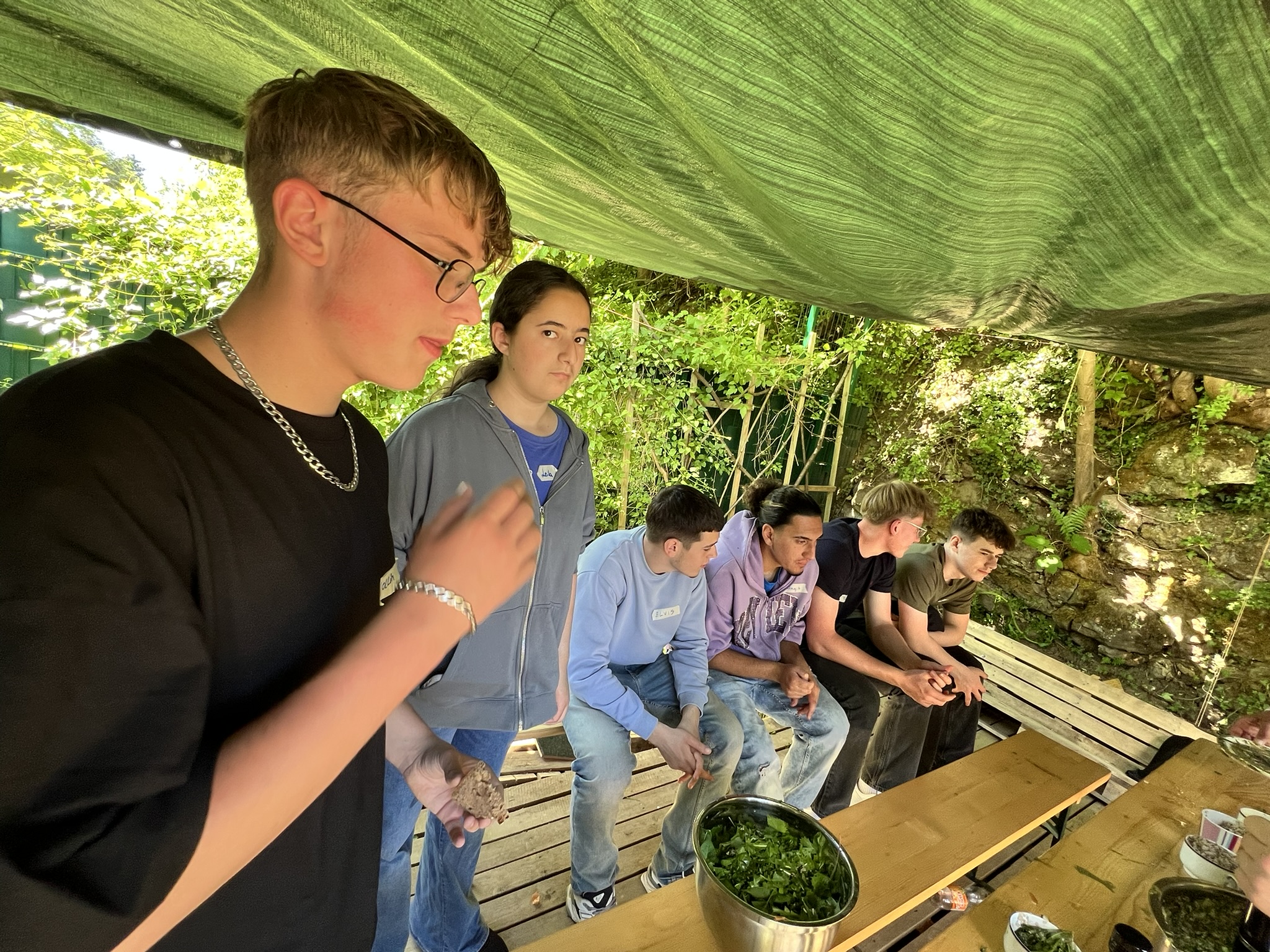 Zum Abschluss wurde es praktisch: Drei Gruppen übernahmen verschiedene Aufgaben auf dem Acker. Eine pflanzte Jungpflanzen ein, eine andere stellte aus Wildkräutern ein leckeres Pesto her, und die dritte Gruppe kümmerte sich um den Boden – mit Rechen und der sogenannten Grelinette. Natürlich durften wir das Pesto auch probieren!