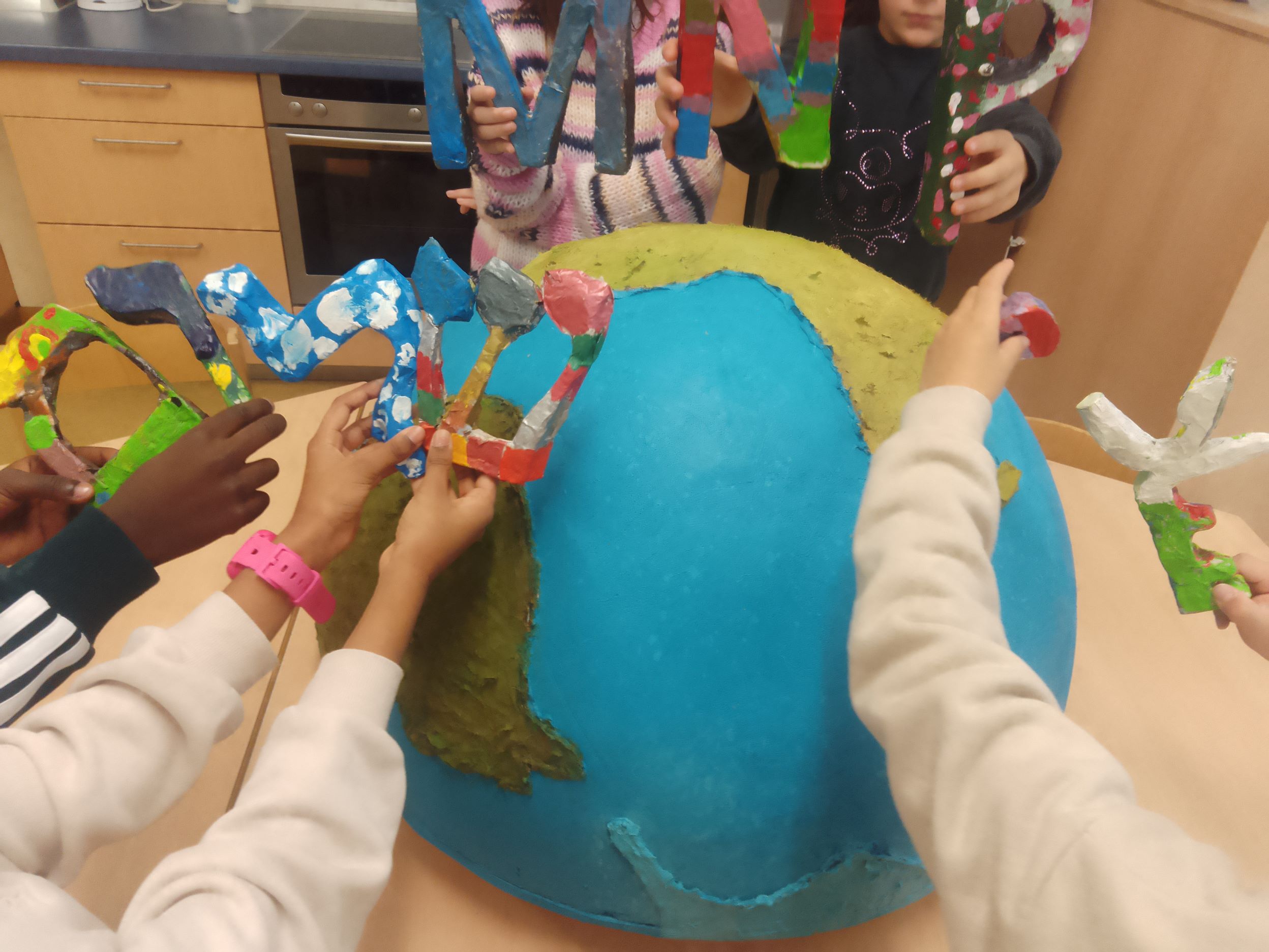 Eine zentrale Rolle übernahmen dabei die Schülerinnen und Schüler aus der Projektgruppe „Ein Wort für Frieden“: Sie stellten im Vorfeld die Roh-Versionen der Buchstaben aus Pappmaché her. Bereits im Schuljahr 2024/25 entstand so eine kleinere Plastik mit den Buchstaben des deutschen Wortes FRIEDEN. In einem Nachfolge-Projekt während der Projektwoche im Sommer 2025 fertigten nun Schülerinnen und Schüler verschiedener Jahrgangsstufen der Sekundarstufe I zusätzliche Schriftzüge an, die das Wort Frieden in den Sprachen Hebräisch, Arabisch und Russisch/Ukrainisch zeigten: MIR, SALAM und SCHALOM.