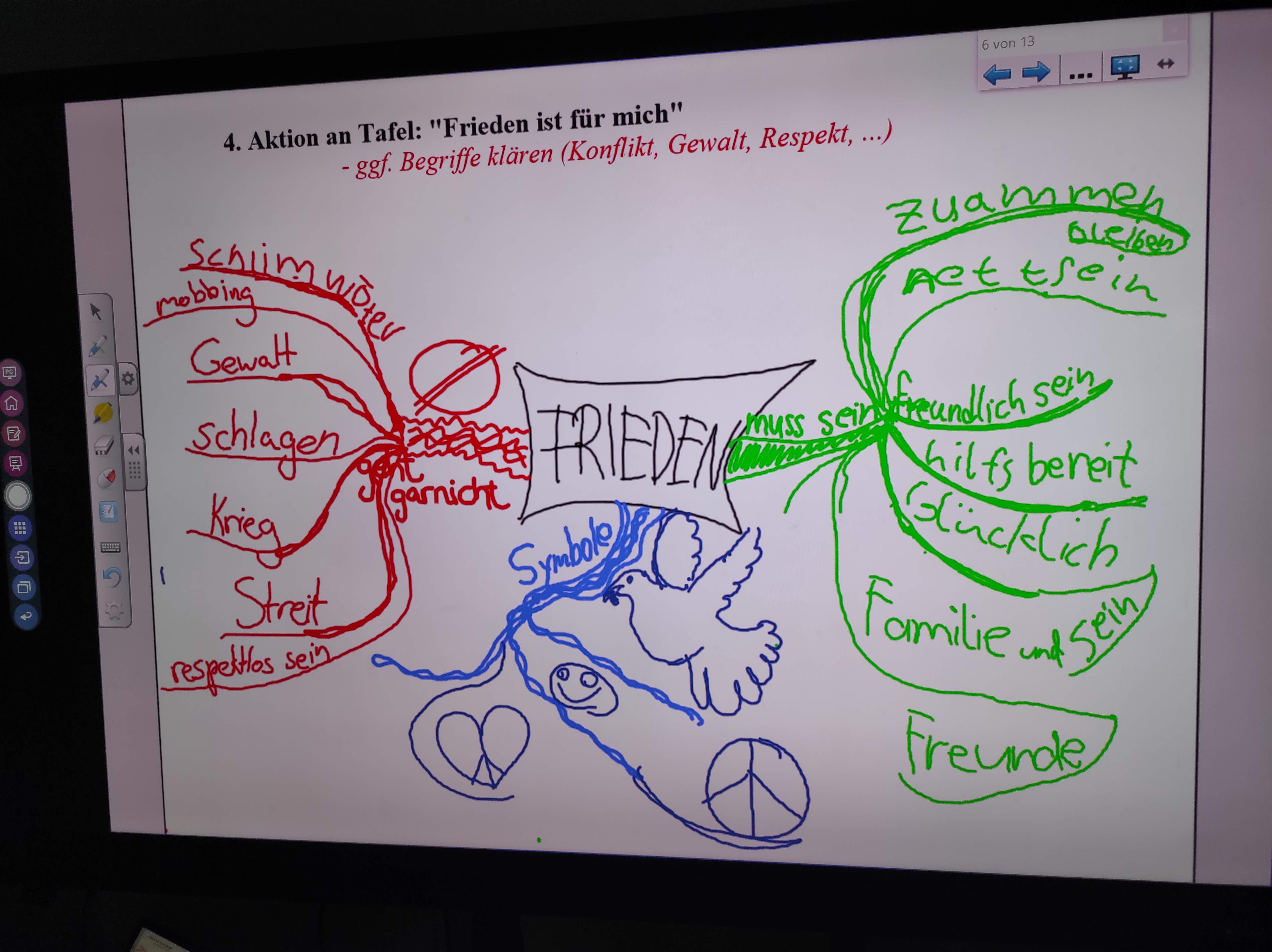 Neben der künstlerischen Arbeit wirkten die Jugendlichen der GE Langerfeld auch pädagogisch: im Rahmen der Kooperation mit der Klasse 3b der KGS St. Antonius erklärten sie als „Junior-Lehrkräfte“ den jüngeren Kindern zunächst, was Frieden bedeutet, woher der Begriff stammt und warum er in verschiedenen Kulturen und Sprachen eine besondere Rolle spielt, z. B. in Grußformeln. Diese Gespräche bildeten die Grundlage für die weitere kreative Arbeit der Grundschulkinder.