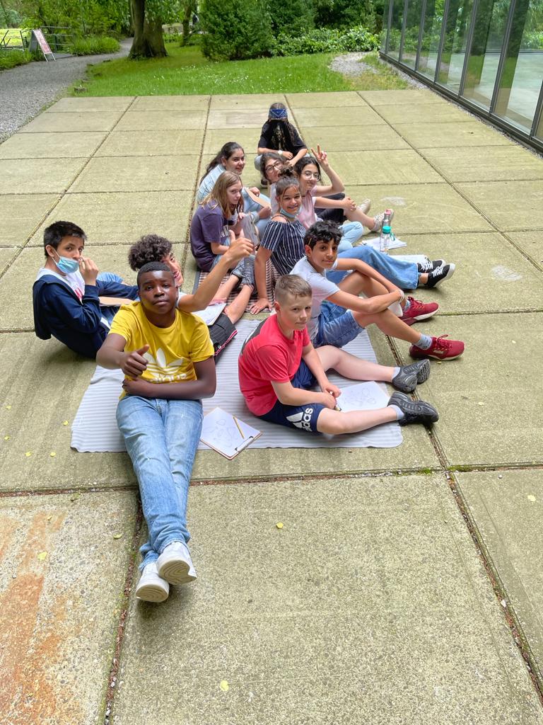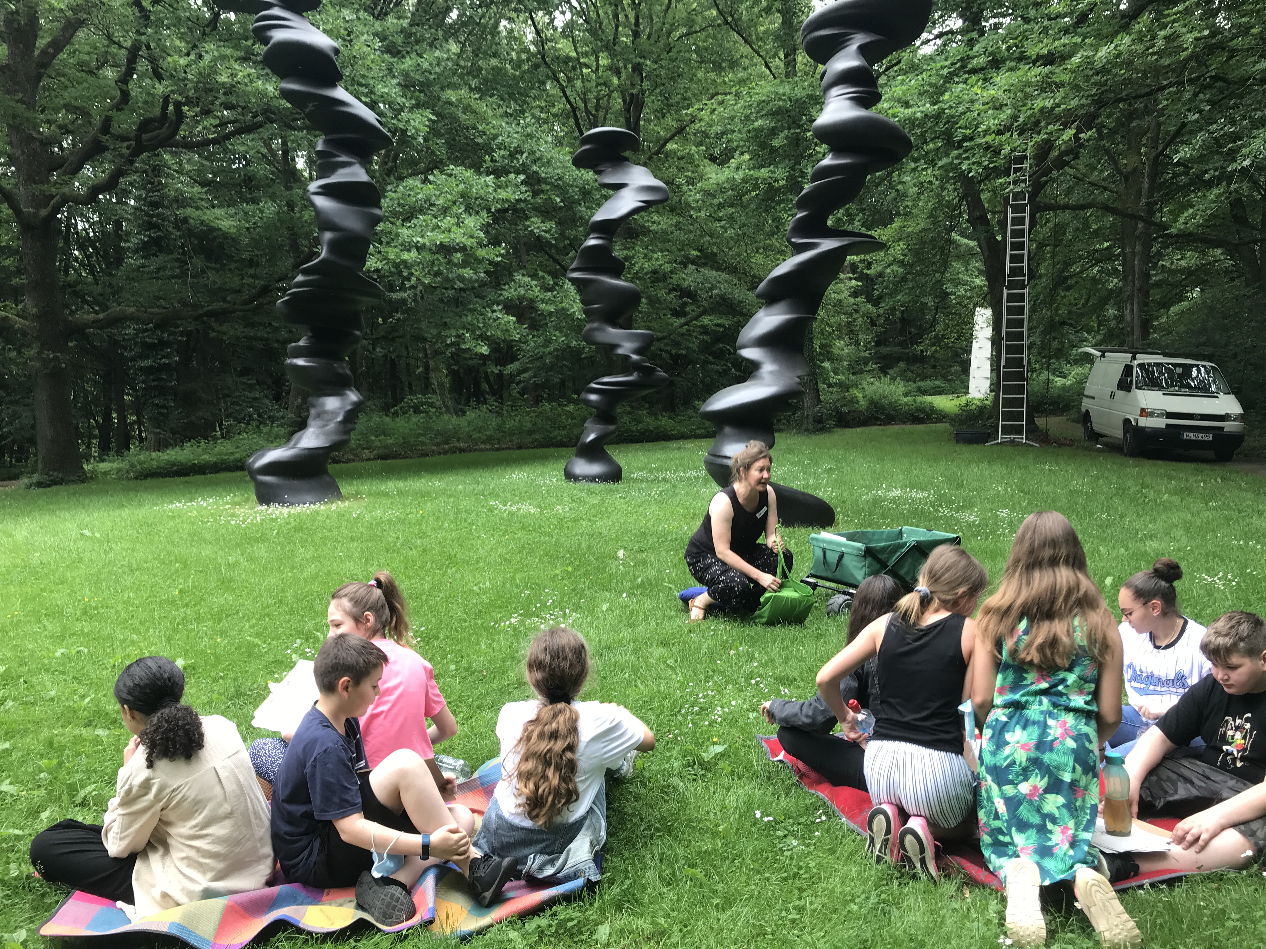 Am Ende haben wir kurz besprochen, was wir gelernt haben und was uns am besten gefallen hat. Besonders gefallen hat uns, dass der Park so sauber und groß ist. Die vielen Infos zu den Kunstwerken waren interessant! Abschließend haben wir den Mitarbeiterinnen noch Feedback gegeben, was sie vielleicht am Workshop verbessern könnten. Hier gab es nicht so viele Anmerkungen, weil mit ihnen und im Park alles sehr schön war. Es war dort sehr ordentlich, es lag kein Müll rum, die beiden Künstlerinnen beantwortete unsere Fragen, hatten Decken zum Sitzen dabei; einige Mitschüler*innen wünschten sich noch ein paar mehr Infos mehr zu den Künstlern.