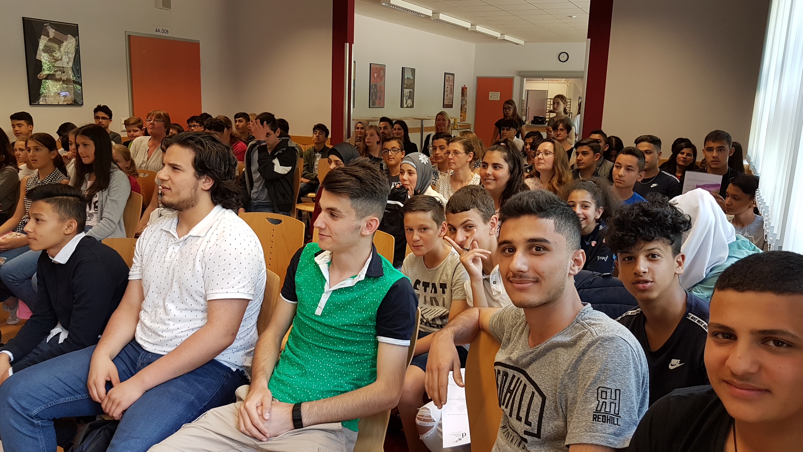 Das Programm begann mit einem musikalischen Beitrag des neu formierten Schulchors unter Leitung von Frau Hardebeck, für den die jungen Sängerinnen und Sänger viel Applaus der ca. 70 Anwesenden erhielten. Herr Baermann würdigte anschließend die Leistungen der Prüflinge. Unser Schulleiter betonte, wie wichtig gute Sprachkenntnisse für den weiteren Werdegang seien. Er bedankte sich bei den Lehrerinnen und Lehrer der SEG-Klassen für die engagierte und erfolgreiche Arbeit. Yasmin (Q1) gratulierte als Schülersprecherin im Namen aller Schülerinnen und Schüler. Danach gab es einige künstlerische Beiträge aus den Reihen der Prüflinge. Omran und Orhan begeisterten als Gesangsduett, Sherwan träumte in seinem Rap von einem Lamborghini und einige Schülerinnen und Schüler trugen kurze Sinnsprüche vor. Schließlich gab der Chor eine weitere Kostprobe seines Könnens.