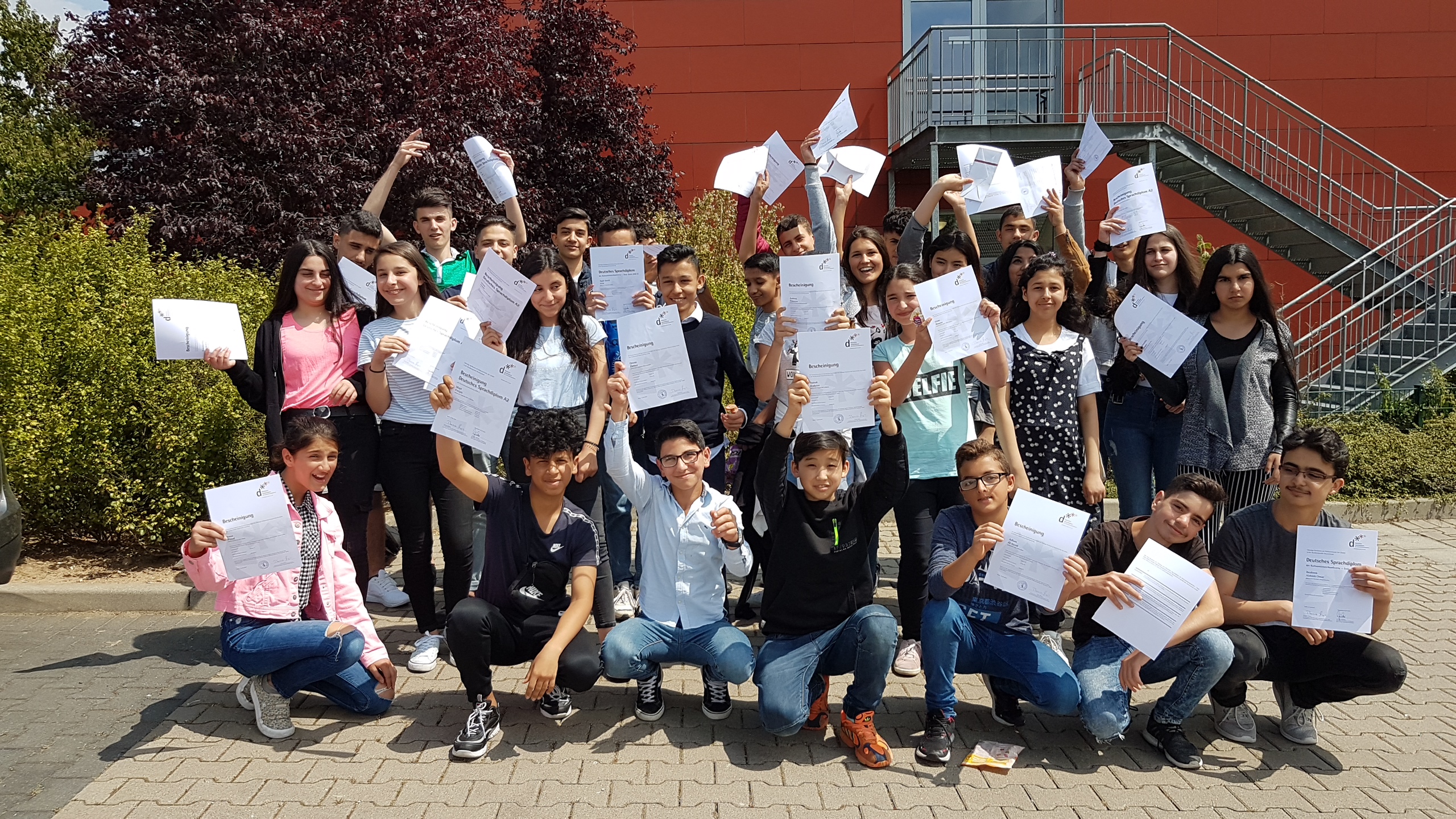 Nun wurden endlich die Zertifikate verliehen. Zunächst erhielten 17 Schülerinnen und Schüler Bescheinigungen für Teilleistungen. Sie hatten in mindestens einer der abgeprüften Teilfertigkeiten (Schreiben, Hören, Lesen, Sprechen) die Niveaustufe A2 oder sogar B1 erreicht. Zwölf Schülerinnen und Schüler hatten in allen vier Kompetenzen mindestens die Niveaustufe A2 nachgewiesen und damit das „Deutsche Sprachdiplom A2“ geschafft. Sieben Schülerinnen und Schüler, nämlich Abdulsalam, Amine, Rida, Samir, Ibrahiem, Amjad und Semih, erhielten sogar das „Deutsche Sprachdiplom B1“. Es wurde ihnen von Yara (9F), die im Vorjahr das beste Prüfungsergebnis der Schule erreicht hatte, überreicht. Der Förderverein hatte es durch seine Unterstützung ermöglicht, dass alle Prüflinge zusätzlich zu den Bescheinigungen und Diplomen ein kleines Präsent erhielten.