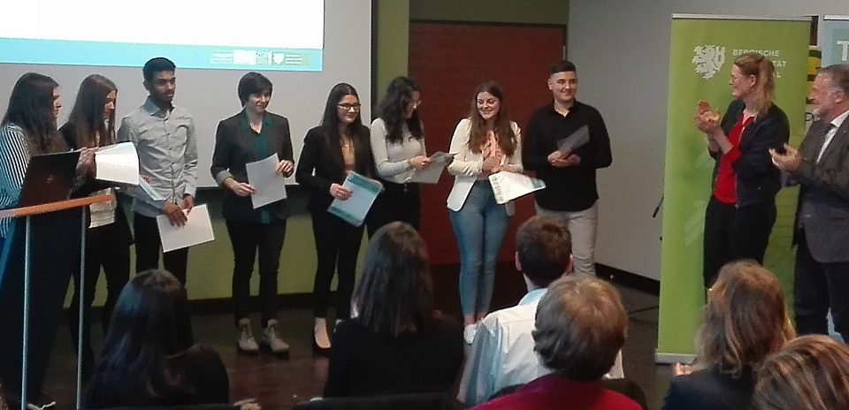 Die Vergabe des Wupper-Stipendiums wurde am Donnerstag, 6.2.2020 im Rahmen einer Feierstunde im Bergischen Zimmer, der „guten Stube“ der Universität Wuppertal, zelebriert. Dort, wo sonst der akademische Rat, das höchste Gremium der Uni, tagt, warteten acht aufgeregte Stipendiat*innen auf die Übergabe des Zertifikats – und unter ihnen Helin P., Schülerin der Q1. Nach Jelena B., die im vergangenen Jahr in der ersten Runde in das Stipendienprogramm aufgenommen wurde und begeistert über die verschiedenen Aktivitäten berichten kann, ist Helin die zweite Schülerin aus Langerfeld, die von der ideellen und finanziellen Förderung profitieren wird.