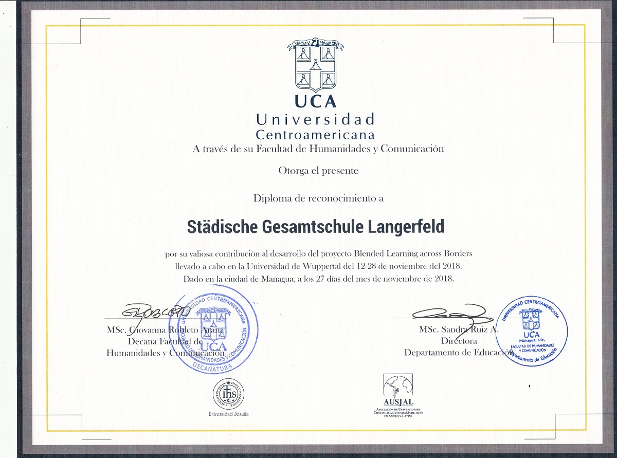 Im Rahmen des Projekts „Blended Learning Across the Borders“ zwischen der Bergischen Universität Wuppertal und der Universidad Centroamericana von Managua besuchten uns am Donnerstag, den 30.11.2018 10 Lehramtstudentinnen und -studenten aus Nicaragua, um sich ein Bild vom Einsatz digitaler Medien an der Gesamtschule Langerfeld zu verschaffen und sich diesen Fragen zu widmen.