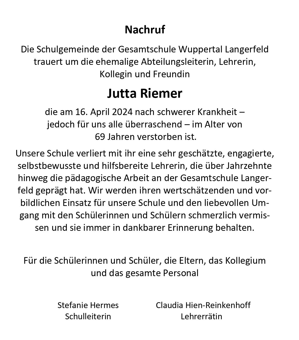 Nachruf - Jutta Riemer