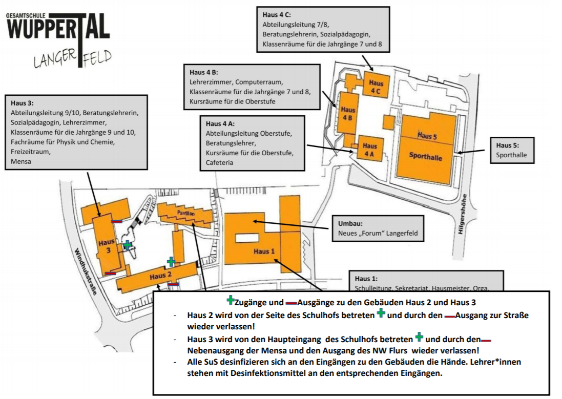 Vor dem Betreten der Gebäude, müsst Ihr euch die Hände desinfizieren. Lehrer*innen stehen mit Desinfektionsmittel an den Eingängen bereit. Bitte befolgt die Laufwege und Regeln. Achtet auf dieSchilder.